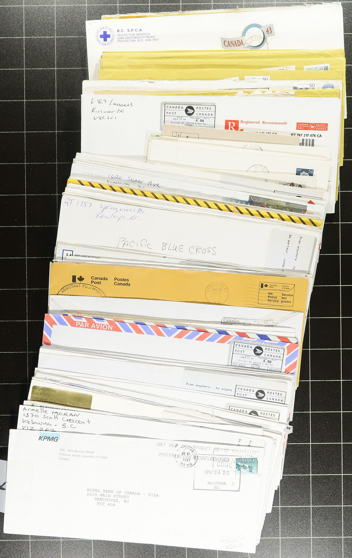 The behemoth BC Postmark Lot. A large box, absolutely stuffed with covers and cut-squares, all with BC Postmarks, arranged by the owner alphabetically. Many thousands of postmarks in total, seemingly primarily from the QEII era, but with earlier noted as well. The perfect lot for the postmark hound, looking for cancellation types, dates etc. Well worth our reasonable estimated value. Estimate =