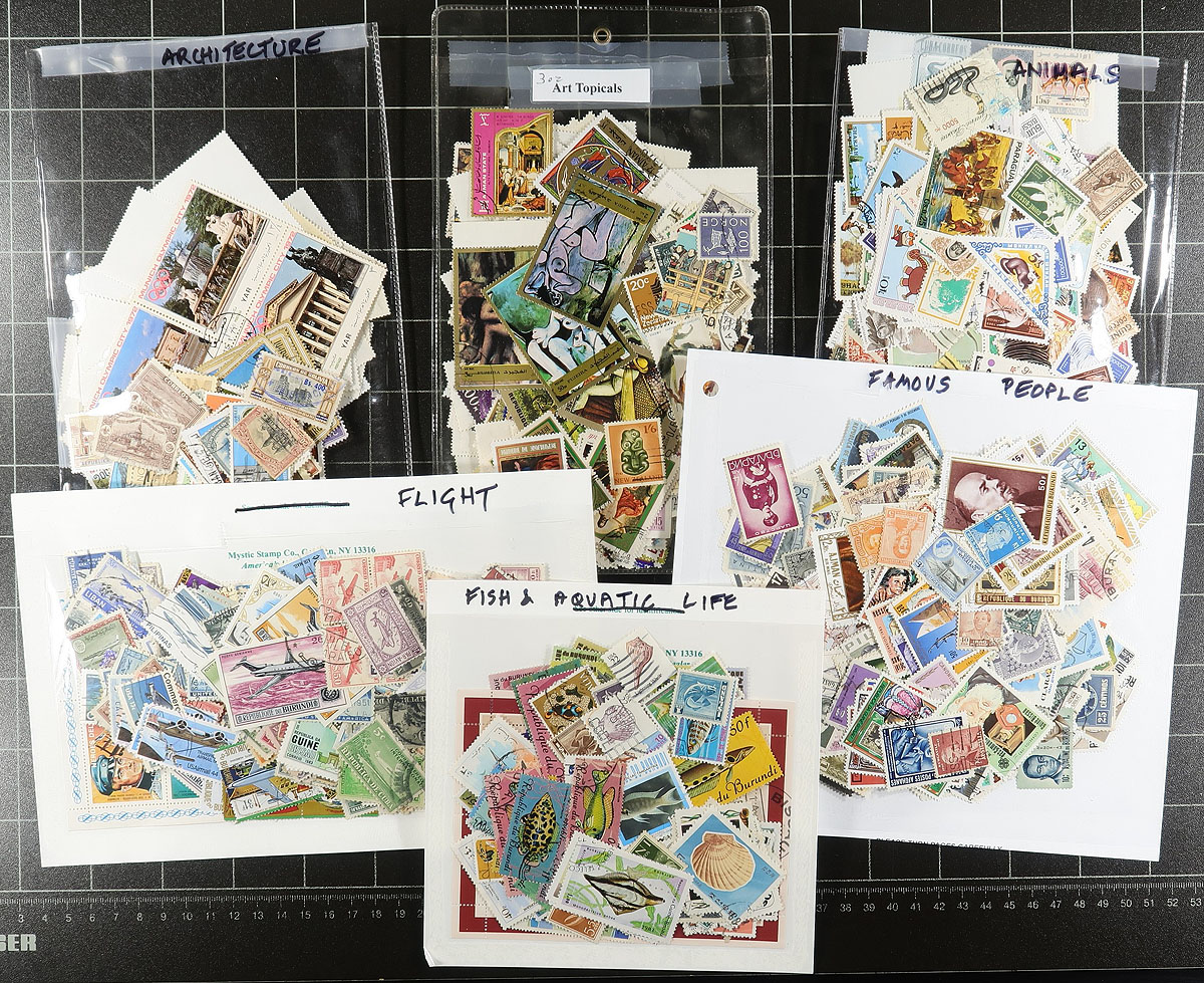 A topical stamp bonanza, held within a stuffed small pizza box (in size only, no pizza within). Comprising of packets of stamps off-paper from around the globe as assembled for topical interest. There are 1-pack of Cats & Dogs, Royalty and Scouting, then 2-packs each of Animals, Architecture, Art, Birds, Boats & Ships, Costumes, Famous People, Fish & Aquatic Life, Flight, Insects (including Butterflies), Medicine, Plants & Fungi, Space, Sports & Games and Transport on Land. An extremely colourful offering. Estimate =
