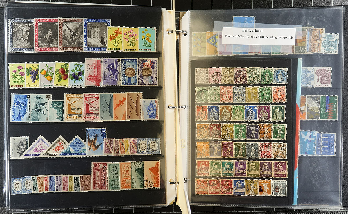 Europe Offering. Meticulously two-part offering, organized in binder and stock. The binder consists of French Andorra 1985 Romanesque Art Mint Sheetlet of 10, Hungary (507 different used and CTO, 1900-1981 including 2 mini-sheets), Poland (531 different, plus duplicated, mostly used and CTO 1919-1986 including a 1945 Red Cross sheetlet), Portugal (primarily) & Colonies (157 different, mint and used), Saar (42 different, mostly sed 1920-1952), San Marino (200 different, mint and used 1877-1983 and Switzerland (225 different, mint and used 1862-1998 including semi-postals. All of the beforementioned is nicely complimented with a stockbook, neatly organized and containing Czechoslovakia and Poland, with 1775 different (Czech is 1096 different, 1918-1992 mostly used including "Back of the Book" / Poland is 679 different, 1919-1976 mostly used). Well organized all-around. Estimate =
