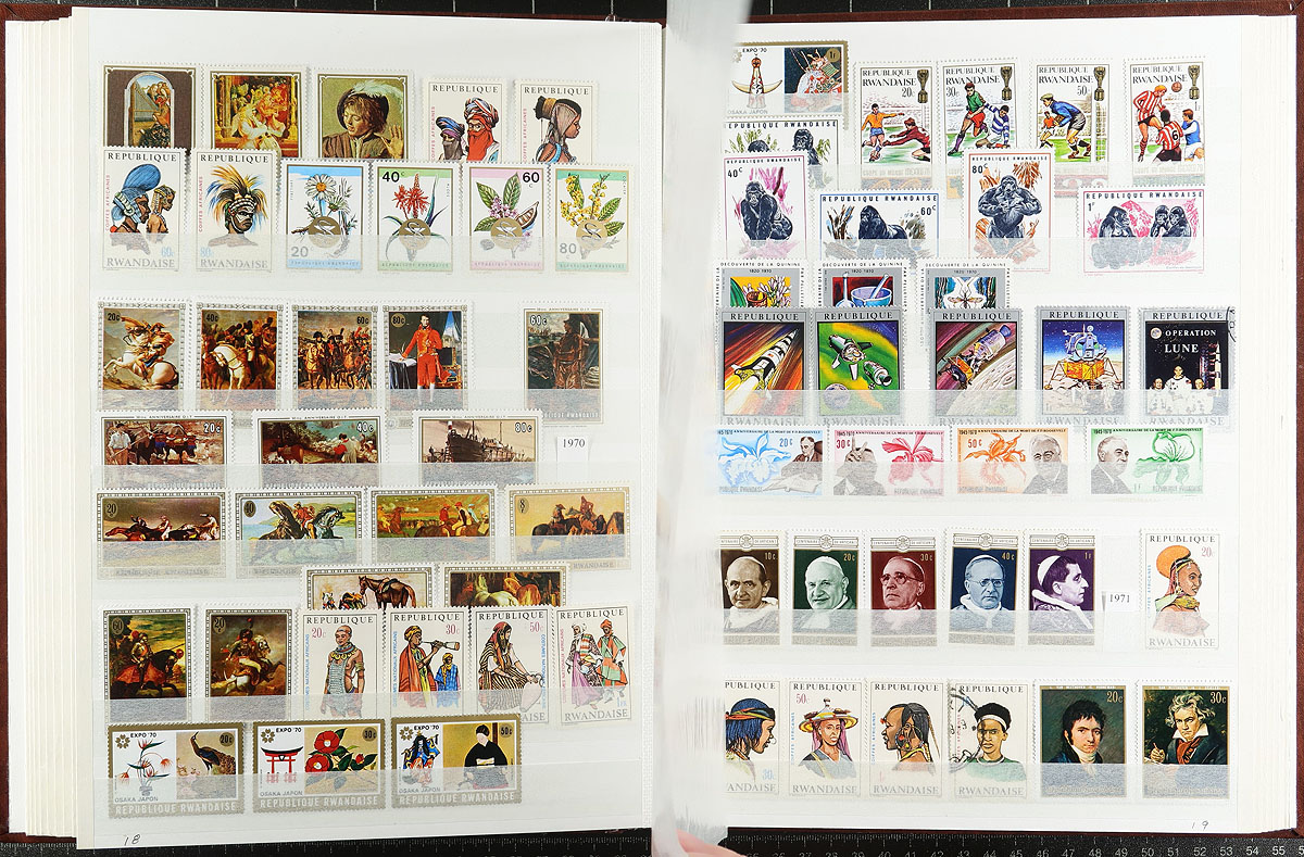 Belgian Congo / Congo and Area. Interesting and diverse mint and used offering of 992 different stamps, plus 7 miniature sheets all nearly organized and contained within a 32-page Unisafe stockbook. Includes Belgian Congo (198 different, 1886-1960), Democratic Republic of Congo (198 different, 1960-1970 + one miniature sheet), Katanga (16 different, 1960), Zaire (64 different, 1971-1992), Ruanda Urundi (97 different, 1916-1959), Rwanda (419 different, 1962-1992 plus 5 minature sheets) and South Kasai (one miniature sheet). An interesting area to collect, with much history over the years, often well depicted on the stamps issued. Estimate =