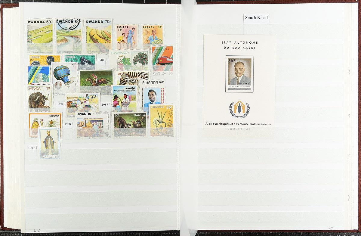 Belgian Congo / Congo and Area. Interesting and diverse mint and used offering of 992 different stamps, plus 7 miniature sheets all nearly organized and contained within a 32-page Unisafe stockbook. Includes Belgian Congo (198 different, 1886-1960), Democratic Republic of Congo (198 different, 1960-1970 + one miniature sheet), Katanga (16 different, 1960), Zaire (64 different, 1971-1992), Ruanda Urundi (97 different, 1916-1959), Rwanda (419 different, 1962-1992 plus 5 minature sheets) and South Kasai (one miniature sheet). An interesting area to collect, with much history over the years, often well depicted on the stamps issued. Estimate =