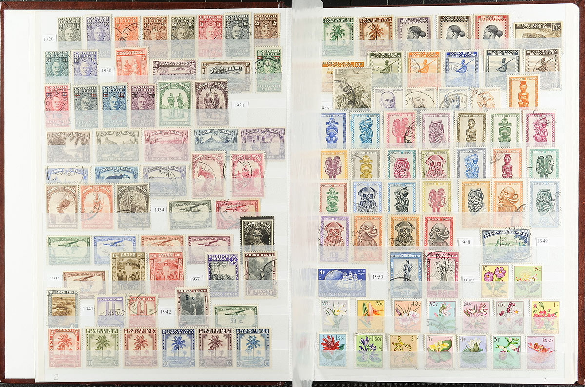 Belgian Congo / Congo and Area. Interesting and diverse mint and used offering of 992 different stamps, plus 7 miniature sheets all nearly organized and contained within a 32-page Unisafe stockbook. Includes Belgian Congo (198 different, 1886-1960), Democratic Republic of Congo (198 different, 1960-1970 + one miniature sheet), Katanga (16 different, 1960), Zaire (64 different, 1971-1992), Ruanda Urundi (97 different, 1916-1959), Rwanda (419 different, 1962-1992 plus 5 minature sheets) and South Kasai (one miniature sheet). An interesting area to collect, with much history over the years, often well depicted on the stamps issued. Estimate =