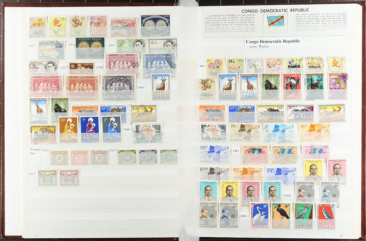 Belgian Congo / Congo and Area. Interesting and diverse mint and used offering of 992 different stamps, plus 7 miniature sheets all nearly organized and contained within a 32-page Unisafe stockbook. Includes Belgian Congo (198 different, 1886-1960), Democratic Republic of Congo (198 different, 1960-1970 + one miniature sheet), Katanga (16 different, 1960), Zaire (64 different, 1971-1992), Ruanda Urundi (97 different, 1916-1959), Rwanda (419 different, 1962-1992 plus 5 minature sheets) and South Kasai (one miniature sheet). An interesting area to collect, with much history over the years, often well depicted on the stamps issued. Estimate =