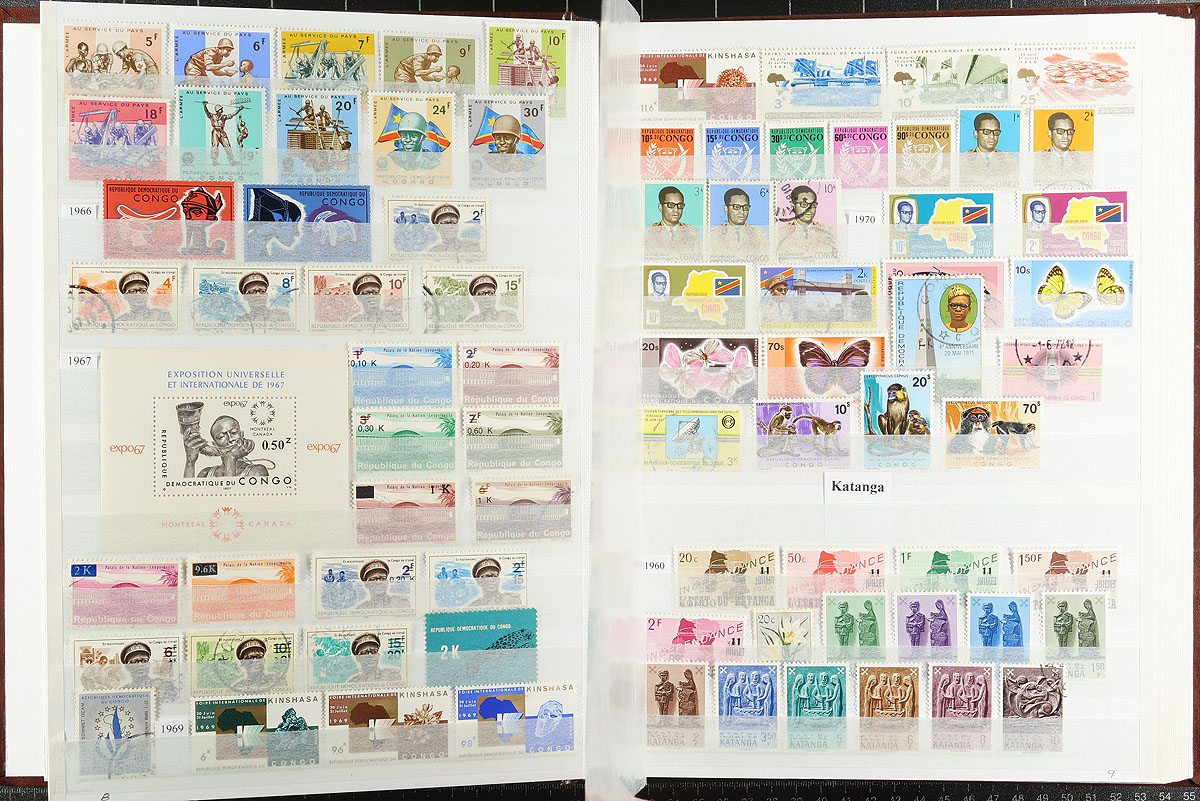Belgian Congo / Congo and Area. Interesting and diverse mint and used offering of 992 different stamps, plus 7 miniature sheets all nearly organized and contained within a 32-page Unisafe stockbook. Includes Belgian Congo (198 different, 1886-1960), Democratic Republic of Congo (198 different, 1960-1970 + one miniature sheet), Katanga (16 different, 1960), Zaire (64 different, 1971-1992), Ruanda Urundi (97 different, 1916-1959), Rwanda (419 different, 1962-1992 plus 5 minature sheets) and South Kasai (one miniature sheet). An interesting area to collect, with much history over the years, often well depicted on the stamps issued. Estimate =