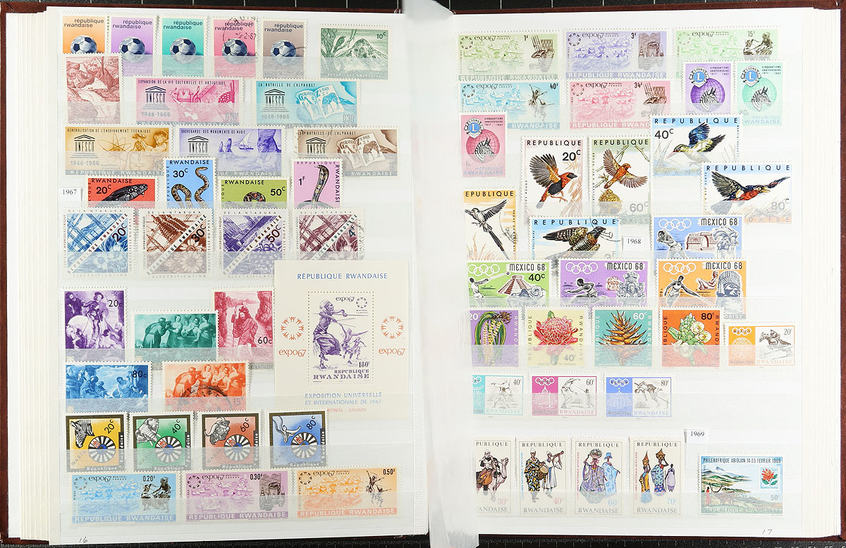Belgian Congo / Congo and Area. Interesting and diverse mint and used offering of 992 different stamps, plus 7 miniature sheets all nearly organized and contained within a 32-page Unisafe stockbook. Includes Belgian Congo (198 different, 1886-1960), Democratic Republic of Congo (198 different, 1960-1970 + one miniature sheet), Katanga (16 different, 1960), Zaire (64 different, 1971-1992), Ruanda Urundi (97 different, 1916-1959), Rwanda (419 different, 1962-1992 plus 5 minature sheets) and South Kasai (one miniature sheet). An interesting area to collect, with much history over the years, often well depicted on the stamps issued. Estimate =