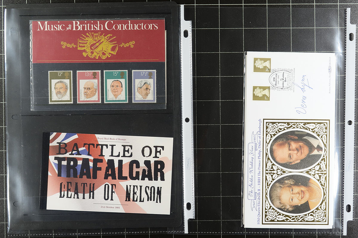 An enticing offering of Great Britain, in two distinct stanzas (binders). The first binder is a selection of QV to QEII, with 340 mint stamps, including 3x half-sheets, 6 new issue packs, QEII Golden Wedding FDC signed by Vera Lynn, Insects FDC signed by David Bellamy and Century in Pictures cover signed by Howard Keel. The second binder has over 1200 different used QV to 2010 issues (with a few early duplicates) including lots of George VI/QEII including the 1975 semi-postals, a nice example of the £10.00 "Britannia", a 1sh booklet, perfins, Machins, Regionals and finishing with 41 of the 1937 Coronation souvenir cinderalla stamps. Meticulously organized. Estimate =
