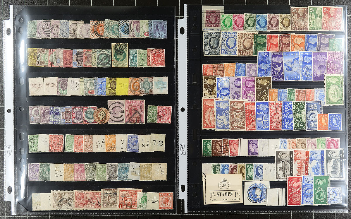 An enticing offering of Great Britain, in two distinct stanzas (binders). The first binder is a selection of QV to QEII, with 340 mint stamps, including 3x half-sheets, 6 new issue packs, QEII Golden Wedding FDC signed by Vera Lynn, Insects FDC signed by David Bellamy and Century in Pictures cover signed by Howard Keel. The second binder has over 1200 different used QV to 2010 issues (with a few early duplicates) including lots of George VI/QEII including the 1975 semi-postals, a nice example of the £10.00 "Britannia", a 1sh booklet, perfins, Machins, Regionals and finishing with 41 of the 1937 Coronation souvenir cinderalla stamps. Meticulously organized. Estimate =