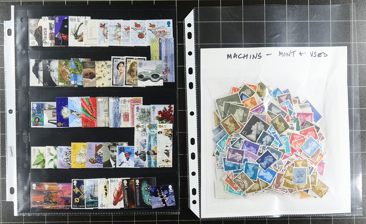 An enticing offering of Great Britain, in two distinct stanzas (binders). The first binder is a selection of QV to QEII, with 340 mint stamps, including 3x half-sheets, 6 new issue packs, QEII Golden Wedding FDC signed by Vera Lynn, Insects FDC signed by David Bellamy and Century in Pictures cover signed by Howard Keel. The second binder has over 1200 different used QV to 2010 issues (with a few early duplicates) including lots of George VI/QEII including the 1975 semi-postals, a nice example of the £10.00 "Britannia", a 1sh booklet, perfins, Machins, Regionals and finishing with 41 of the 1937 Coronation souvenir cinderalla stamps. Meticulously organized. Estimate =
