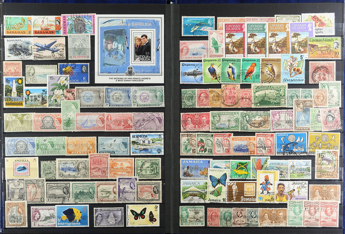 Meticulously organized two stockbook offering (both 32-page albums). The first stockbook contains a mint collection of 380 stamps, 15 blocks, 5 part-sheets, 48 miniature sheets, a strip and 9 booklets from dozens of countries, plus an additional bonus 3 pages of Registration, "Tauschensendung", Express, Priority and misc labels. The second stockbook contains GB and Commonwealth, with 1022 different used GB, 1862-2008 (including loads of commemorative issues, including the British "Millenium" series) and 977 different mint and used (plus 2 mini-sheets) Commonwealth stamps. Well organized and loads of valued throughout both books. Estimate =