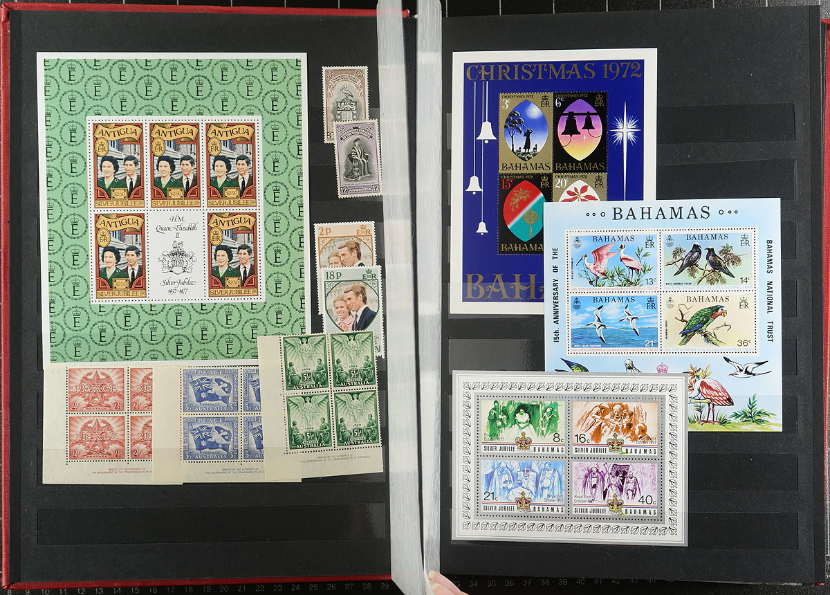 Meticulously organized two stockbook offering (both 32-page albums). The first stockbook contains a mint collection of 380 stamps, 15 blocks, 5 part-sheets, 48 miniature sheets, a strip and 9 booklets from dozens of countries, plus an additional bonus 3 pages of Registration, "Tauschensendung", Express, Priority and misc labels. The second stockbook contains GB and Commonwealth, with 1022 different used GB, 1862-2008 (including loads of commemorative issues, including the British "Millenium" series) and 977 different mint and used (plus 2 mini-sheets) Commonwealth stamps. Well organized and loads of valued throughout both books. Estimate =