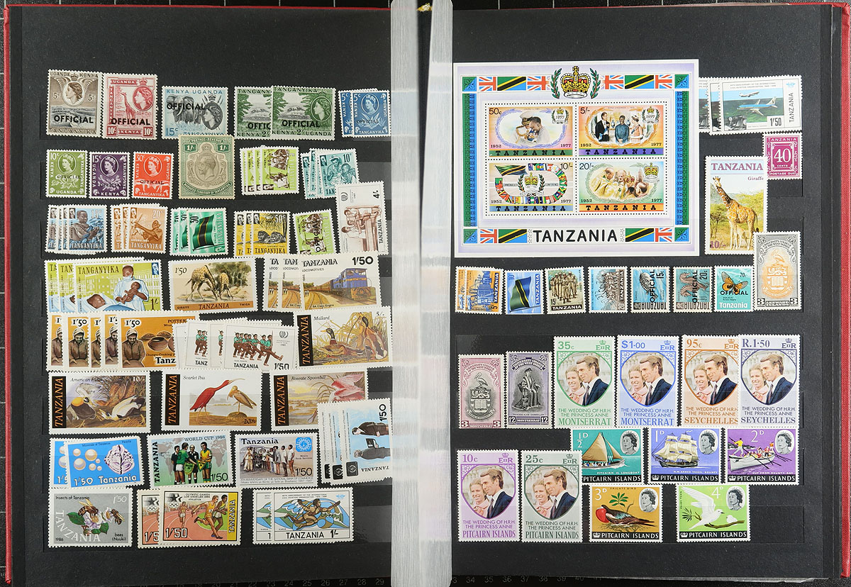 Meticulously organized two stockbook offering (both 32-page albums). The first stockbook contains a mint collection of 380 stamps, 15 blocks, 5 part-sheets, 48 miniature sheets, a strip and 9 booklets from dozens of countries, plus an additional bonus 3 pages of Registration, "Tauschensendung", Express, Priority and misc labels. The second stockbook contains GB and Commonwealth, with 1022 different used GB, 1862-2008 (including loads of commemorative issues, including the British "Millenium" series) and 977 different mint and used (plus 2 mini-sheets) Commonwealth stamps. Well organized and loads of valued throughout both books. Estimate =
