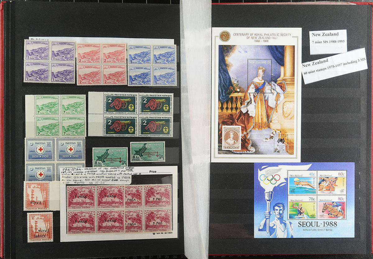 Meticulously organized two stockbook offering (both 32-page albums). The first stockbook contains a mint collection of 380 stamps, 15 blocks, 5 part-sheets, 48 miniature sheets, a strip and 9 booklets from dozens of countries, plus an additional bonus 3 pages of Registration, "Tauschensendung", Express, Priority and misc labels. The second stockbook contains GB and Commonwealth, with 1022 different used GB, 1862-2008 (including loads of commemorative issues, including the British "Millenium" series) and 977 different mint and used (plus 2 mini-sheets) Commonwealth stamps. Well organized and loads of valued throughout both books. Estimate =