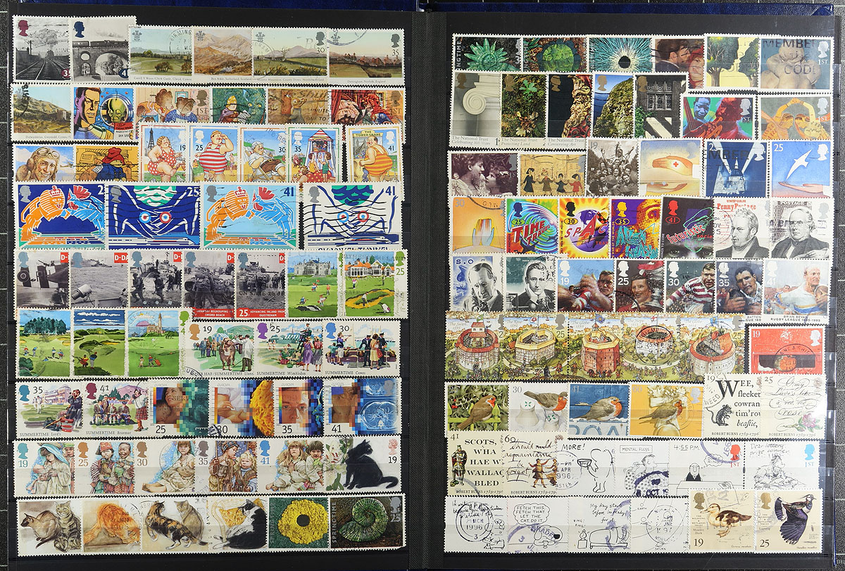 Meticulously organized two stockbook offering (both 32-page albums). The first stockbook contains a mint collection of 380 stamps, 15 blocks, 5 part-sheets, 48 miniature sheets, a strip and 9 booklets from dozens of countries, plus an additional bonus 3 pages of Registration, "Tauschensendung", Express, Priority and misc labels. The second stockbook contains GB and Commonwealth, with 1022 different used GB, 1862-2008 (including loads of commemorative issues, including the British "Millenium" series) and 977 different mint and used (plus 2 mini-sheets) Commonwealth stamps. Well organized and loads of valued throughout both books. Estimate =