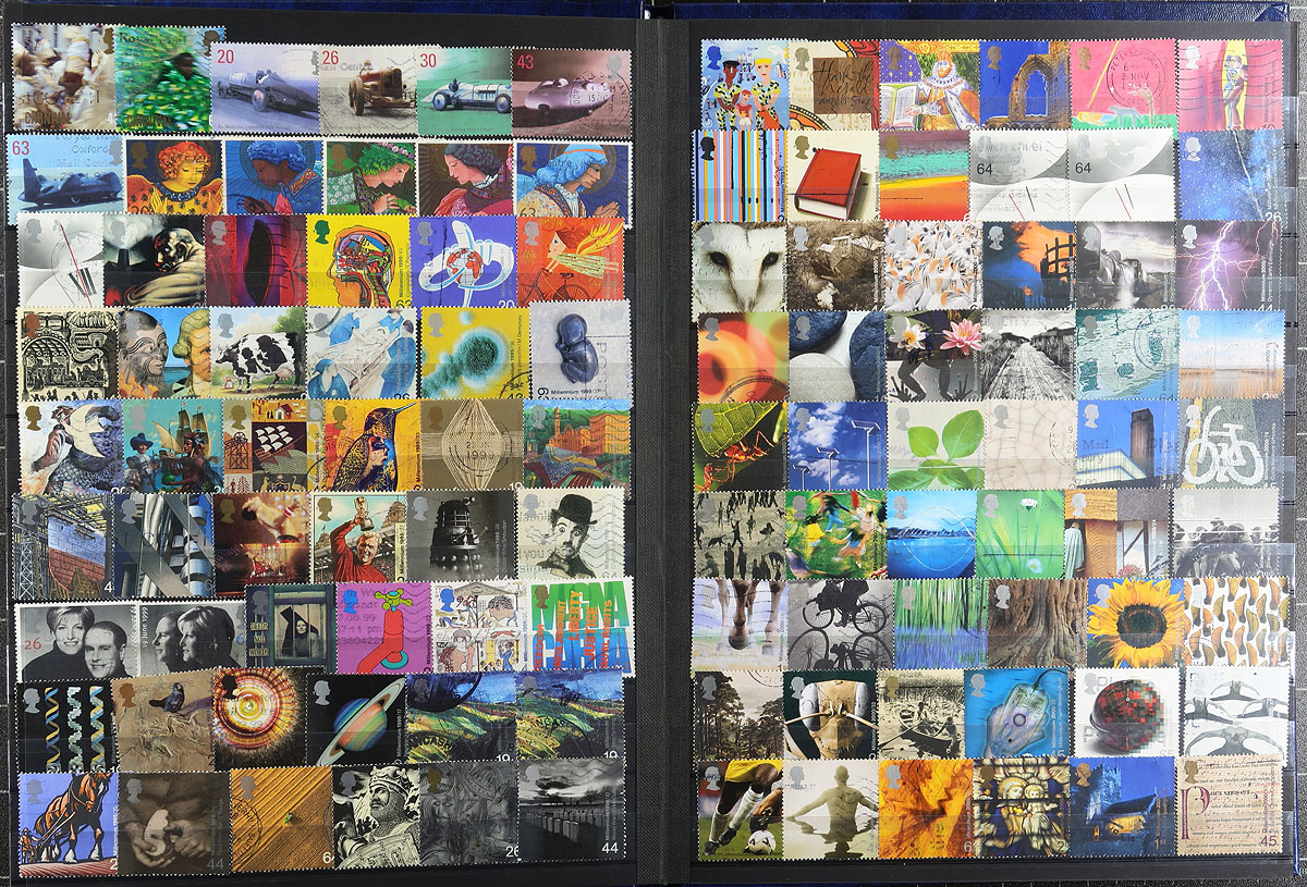 Meticulously organized two stockbook offering (both 32-page albums). The first stockbook contains a mint collection of 380 stamps, 15 blocks, 5 part-sheets, 48 miniature sheets, a strip and 9 booklets from dozens of countries, plus an additional bonus 3 pages of Registration, "Tauschensendung", Express, Priority and misc labels. The second stockbook contains GB and Commonwealth, with 1022 different used GB, 1862-2008 (including loads of commemorative issues, including the British "Millenium" series) and 977 different mint and used (plus 2 mini-sheets) Commonwealth stamps. Well organized and loads of valued throughout both books. Estimate =
