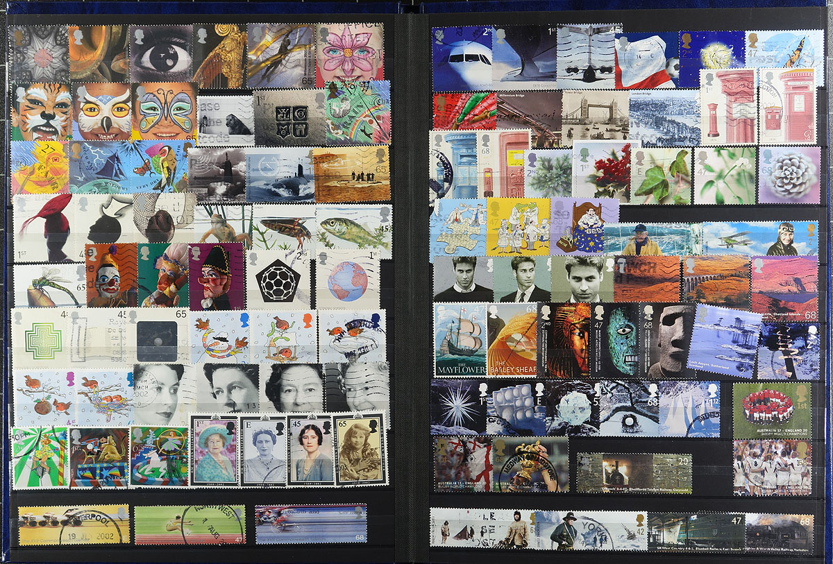 Meticulously organized two stockbook offering (both 32-page albums). The first stockbook contains a mint collection of 380 stamps, 15 blocks, 5 part-sheets, 48 miniature sheets, a strip and 9 booklets from dozens of countries, plus an additional bonus 3 pages of Registration, "Tauschensendung", Express, Priority and misc labels. The second stockbook contains GB and Commonwealth, with 1022 different used GB, 1862-2008 (including loads of commemorative issues, including the British "Millenium" series) and 977 different mint and used (plus 2 mini-sheets) Commonwealth stamps. Well organized and loads of valued throughout both books. Estimate =
