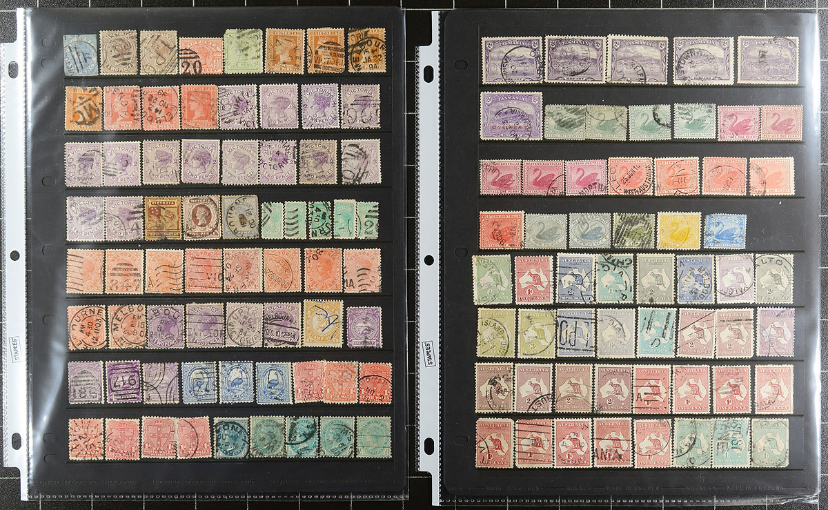 A binder containing stockpages from 4 distinct sections of the British Empire / Commonwealth, meticulously organized by a collector with an eye for detail. In no particular order, this lot includes. 1) Australian States, 161 stamps (43 different) and Australia, 1460 stamps (617 different), mostly used. 2) Bermuda mint sheets / part sheets of 37 issues from the 1948-1949, then 1966-1969 period. 3) New Zealand with 1089 stamps (553 different), mostly used + one booklet and one set of "Specimen" birds. 4) South Africa / RSA with 214 different used stamps, 1910-1995 plus 3 mint miniature sheets. A very tidy offering. Estimate =