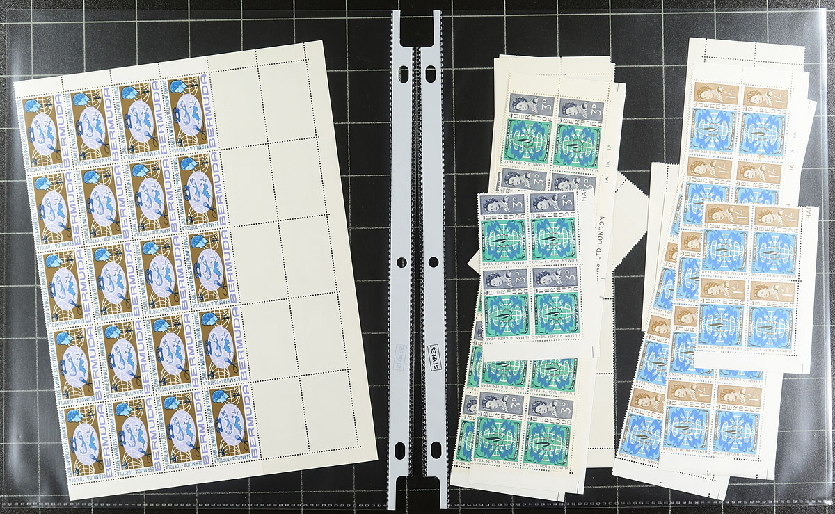 A binder containing stockpages from 4 distinct sections of the British Empire / Commonwealth, meticulously organized by a collector with an eye for detail. In no particular order, this lot includes. 1) Australian States, 161 stamps (43 different) and Australia, 1460 stamps (617 different), mostly used. 2) Bermuda mint sheets / part sheets of 37 issues from the 1948-1949, then 1966-1969 period. 3) New Zealand with 1089 stamps (553 different), mostly used + one booklet and one set of "Specimen" birds. 4) South Africa / RSA with 214 different used stamps, 1910-1995 plus 3 mint miniature sheets. A very tidy offering. Estimate =
