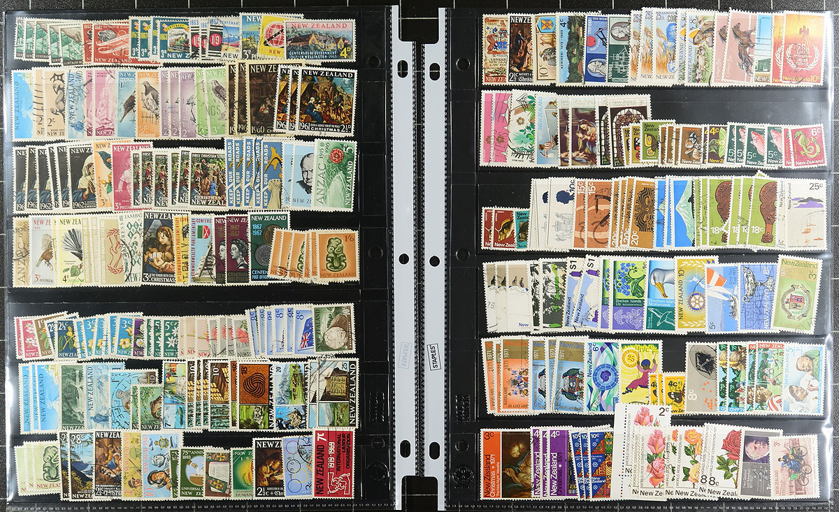 A binder containing stockpages from 4 distinct sections of the British Empire / Commonwealth, meticulously organized by a collector with an eye for detail. In no particular order, this lot includes. 1) Australian States, 161 stamps (43 different) and Australia, 1460 stamps (617 different), mostly used. 2) Bermuda mint sheets / part sheets of 37 issues from the 1948-1949, then 1966-1969 period. 3) New Zealand with 1089 stamps (553 different), mostly used + one booklet and one set of "Specimen" birds. 4) South Africa / RSA with 214 different used stamps, 1910-1995 plus 3 mint miniature sheets. A very tidy offering. Estimate =