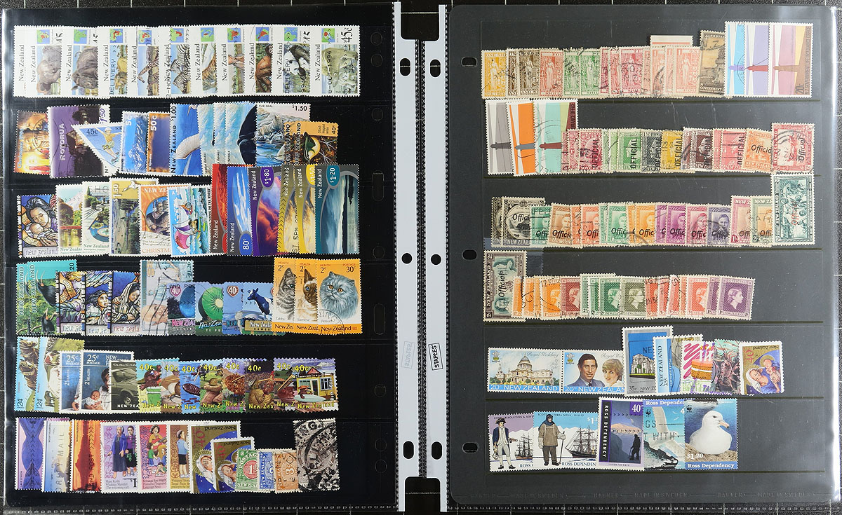 A binder containing stockpages from 4 distinct sections of the British Empire / Commonwealth, meticulously organized by a collector with an eye for detail. In no particular order, this lot includes. 1) Australian States, 161 stamps (43 different) and Australia, 1460 stamps (617 different), mostly used. 2) Bermuda mint sheets / part sheets of 37 issues from the 1948-1949, then 1966-1969 period. 3) New Zealand with 1089 stamps (553 different), mostly used + one booklet and one set of "Specimen" birds. 4) South Africa / RSA with 214 different used stamps, 1910-1995 plus 3 mint miniature sheets. A very tidy offering. Estimate =