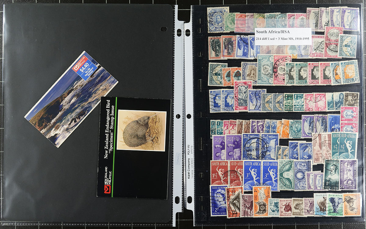 A binder containing stockpages from 4 distinct sections of the British Empire / Commonwealth, meticulously organized by a collector with an eye for detail. In no particular order, this lot includes. 1) Australian States, 161 stamps (43 different) and Australia, 1460 stamps (617 different), mostly used. 2) Bermuda mint sheets / part sheets of 37 issues from the 1948-1949, then 1966-1969 period. 3) New Zealand with 1089 stamps (553 different), mostly used + one booklet and one set of "Specimen" birds. 4) South Africa / RSA with 214 different used stamps, 1910-1995 plus 3 mint miniature sheets. A very tidy offering. Estimate =