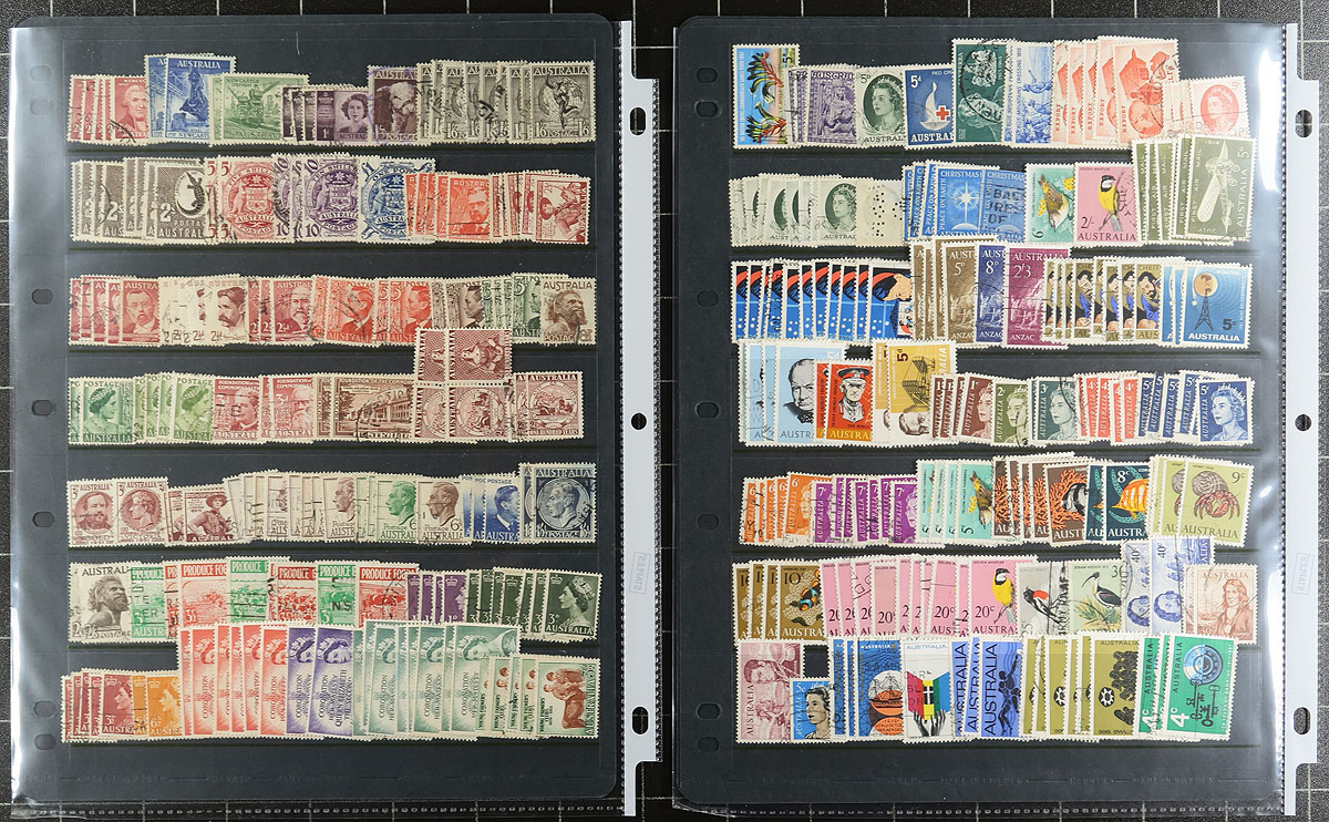 A binder containing stockpages from 4 distinct sections of the British Empire / Commonwealth, meticulously organized by a collector with an eye for detail. In no particular order, this lot includes. 1) Australian States, 161 stamps (43 different) and Australia, 1460 stamps (617 different), mostly used. 2) Bermuda mint sheets / part sheets of 37 issues from the 1948-1949, then 1966-1969 period. 3) New Zealand with 1089 stamps (553 different), mostly used + one booklet and one set of "Specimen" birds. 4) South Africa / RSA with 214 different used stamps, 1910-1995 plus 3 mint miniature sheets. A very tidy offering. Estimate =