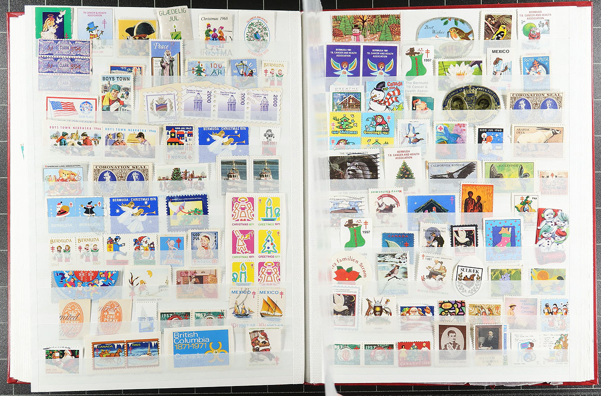 A pair of red stockbooks, both by Unitrade (one a 32-page, the other an old-stock 48 page) with different "end of consignment" offerings that although were not quite powerful on their own, combined make for an enticing offer. The first stockbook (32-page) is United Nations / Cinderella offering, with nicely curated lifetime mint UN collection, complete to 1983 for regular issues as well as the later Geneva and Vienna, with 711 different stamps (after 1983, both mint and used), followed by 624 mixed Cinderella / Label stamps and an sheet of "US Presidents" (for those thinking of being nostalgic for H.E. Harris approvals). The second stockbook (48-page) is the "World" with 23 countries, strength in USA to 1975, Japan, Yugoslavia, Mongolia and Turkey with 2789 different mint and used, plus 2 miniature sheets. All well organized by a meticulous collector. Estimate =
