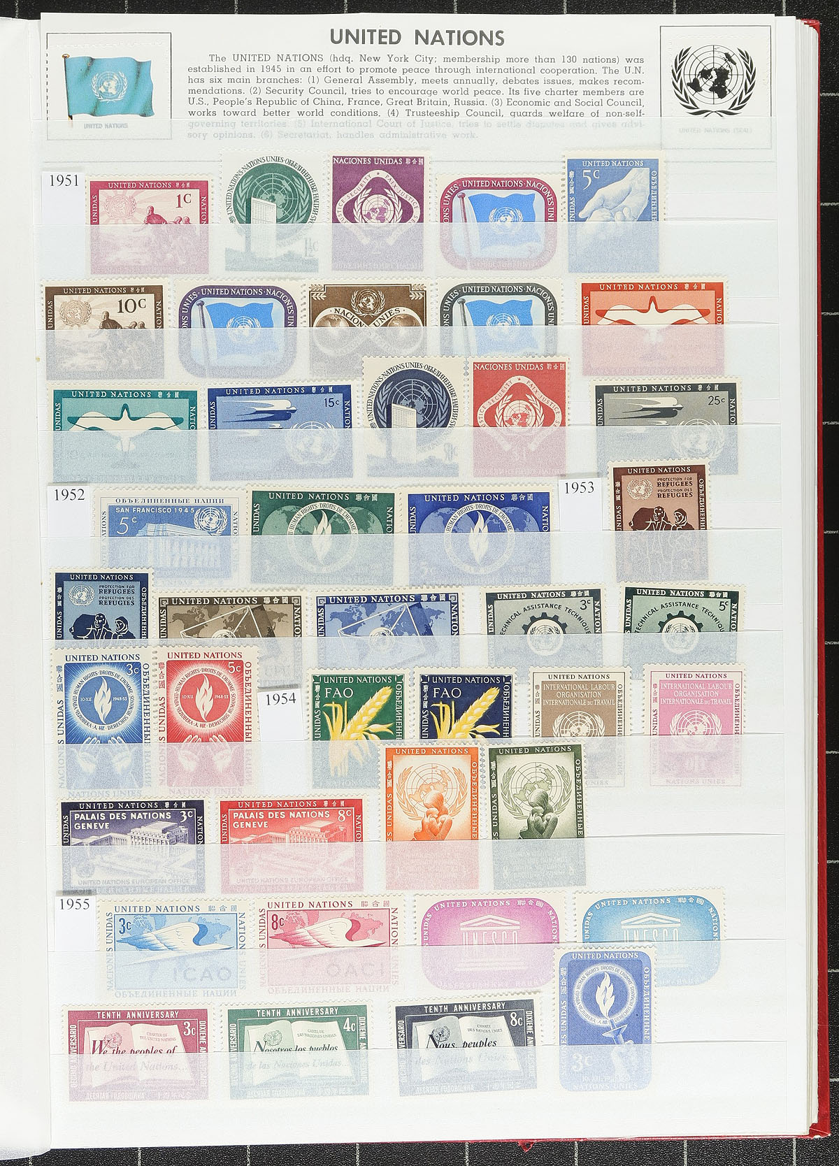 A pair of red stockbooks, both by Unitrade (one a 32-page, the other an old-stock 48 page) with different "end of consignment" offerings that although were not quite powerful on their own, combined make for an enticing offer. The first stockbook (32-page) is United Nations / Cinderella offering, with nicely curated lifetime mint UN collection, complete to 1983 for regular issues as well as the later Geneva and Vienna, with 711 different stamps (after 1983, both mint and used), followed by 624 mixed Cinderella / Label stamps and an sheet of "US Presidents" (for those thinking of being nostalgic for H.E. Harris approvals). The second stockbook (48-page) is the "World" with 23 countries, strength in USA to 1975, Japan, Yugoslavia, Mongolia and Turkey with 2789 different mint and used, plus 2 miniature sheets. All well organized by a meticulous collector. Estimate =