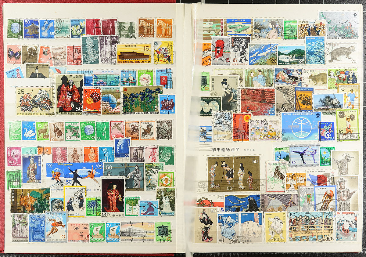 A pair of red stockbooks, both by Unitrade (one a 32-page, the other an old-stock 48 page) with different "end of consignment" offerings that although were not quite powerful on their own, combined make for an enticing offer. The first stockbook (32-page) is United Nations / Cinderella offering, with nicely curated lifetime mint UN collection, complete to 1983 for regular issues as well as the later Geneva and Vienna, with 711 different stamps (after 1983, both mint and used), followed by 624 mixed Cinderella / Label stamps and an sheet of "US Presidents" (for those thinking of being nostalgic for H.E. Harris approvals). The second stockbook (48-page) is the "World" with 23 countries, strength in USA to 1975, Japan, Yugoslavia, Mongolia and Turkey with 2789 different mint and used, plus 2 miniature sheets. All well organized by a meticulous collector. Estimate =