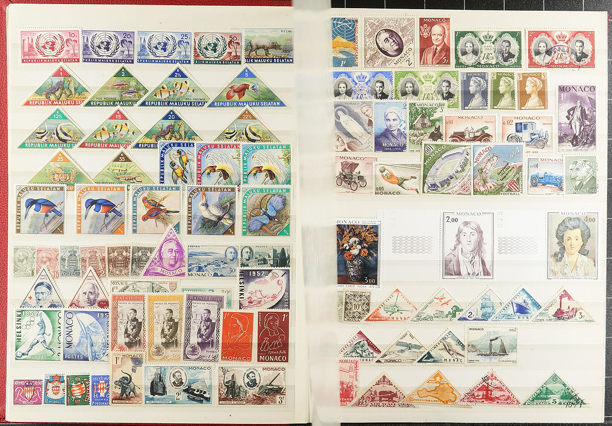 A pair of red stockbooks, both by Unitrade (one a 32-page, the other an old-stock 48 page) with different "end of consignment" offerings that although were not quite powerful on their own, combined make for an enticing offer. The first stockbook (32-page) is United Nations / Cinderella offering, with nicely curated lifetime mint UN collection, complete to 1983 for regular issues as well as the later Geneva and Vienna, with 711 different stamps (after 1983, both mint and used), followed by 624 mixed Cinderella / Label stamps and an sheet of "US Presidents" (for those thinking of being nostalgic for H.E. Harris approvals). The second stockbook (48-page) is the "World" with 23 countries, strength in USA to 1975, Japan, Yugoslavia, Mongolia and Turkey with 2789 different mint and used, plus 2 miniature sheets. All well organized by a meticulous collector. Estimate =
