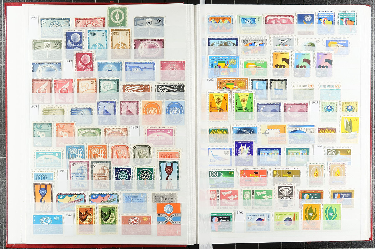A pair of red stockbooks, both by Unitrade (one a 32-page, the other an old-stock 48 page) with different "end of consignment" offerings that although were not quite powerful on their own, combined make for an enticing offer. The first stockbook (32-page) is United Nations / Cinderella offering, with nicely curated lifetime mint UN collection, complete to 1983 for regular issues as well as the later Geneva and Vienna, with 711 different stamps (after 1983, both mint and used), followed by 624 mixed Cinderella / Label stamps and an sheet of "US Presidents" (for those thinking of being nostalgic for H.E. Harris approvals). The second stockbook (48-page) is the "World" with 23 countries, strength in USA to 1975, Japan, Yugoslavia, Mongolia and Turkey with 2789 different mint and used, plus 2 miniature sheets. All well organized by a meticulous collector. Estimate =