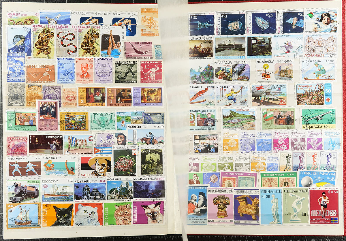 A pair of red stockbooks, both by Unitrade (one a 32-page, the other an old-stock 48 page) with different "end of consignment" offerings that although were not quite powerful on their own, combined make for an enticing offer. The first stockbook (32-page) is United Nations / Cinderella offering, with nicely curated lifetime mint UN collection, complete to 1983 for regular issues as well as the later Geneva and Vienna, with 711 different stamps (after 1983, both mint and used), followed by 624 mixed Cinderella / Label stamps and an sheet of "US Presidents" (for those thinking of being nostalgic for H.E. Harris approvals). The second stockbook (48-page) is the "World" with 23 countries, strength in USA to 1975, Japan, Yugoslavia, Mongolia and Turkey with 2789 different mint and used, plus 2 miniature sheets. All well organized by a meticulous collector. Estimate =