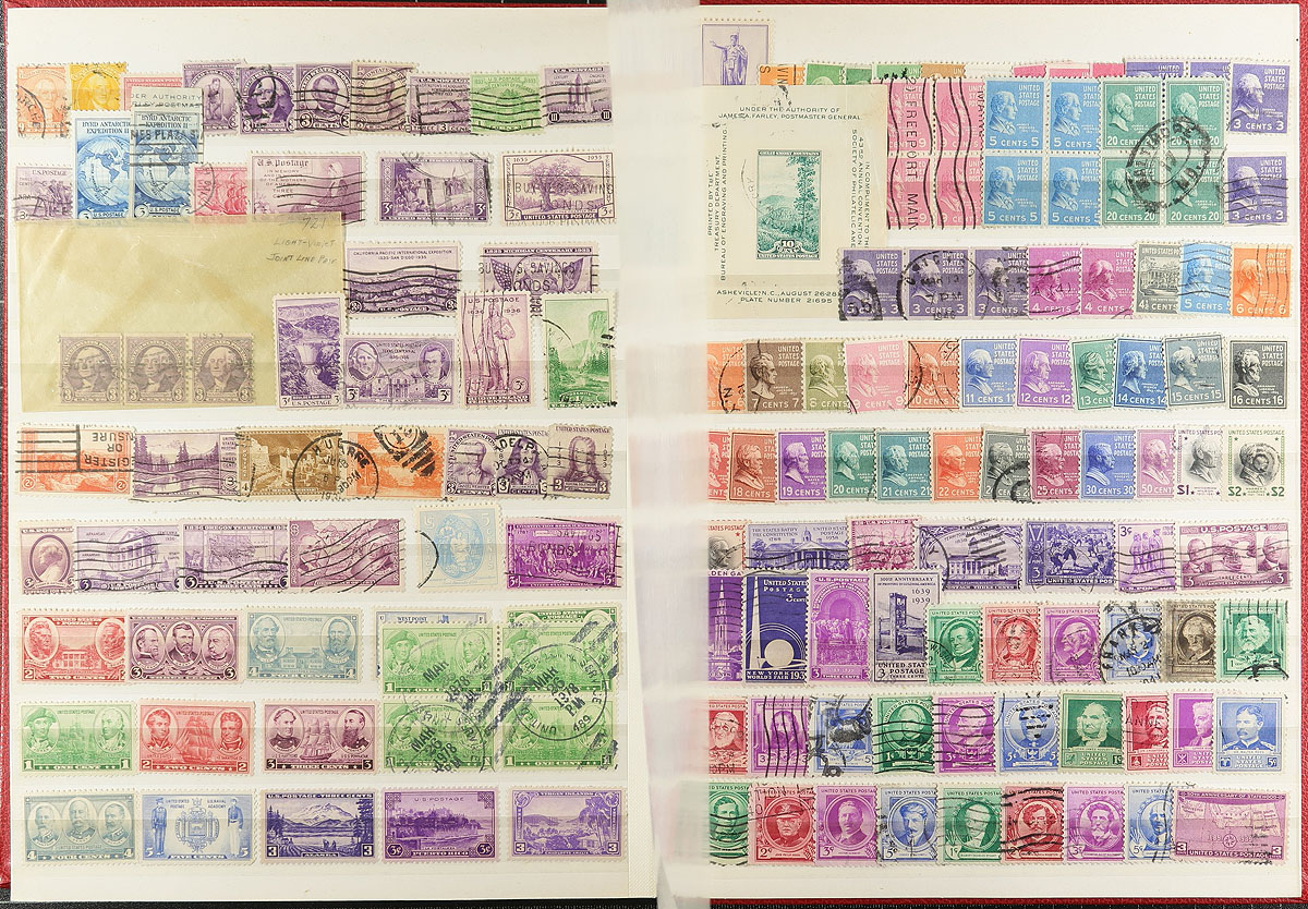 A pair of red stockbooks, both by Unitrade (one a 32-page, the other an old-stock 48 page) with different "end of consignment" offerings that although were not quite powerful on their own, combined make for an enticing offer. The first stockbook (32-page) is United Nations / Cinderella offering, with nicely curated lifetime mint UN collection, complete to 1983 for regular issues as well as the later Geneva and Vienna, with 711 different stamps (after 1983, both mint and used), followed by 624 mixed Cinderella / Label stamps and an sheet of "US Presidents" (for those thinking of being nostalgic for H.E. Harris approvals). The second stockbook (48-page) is the "World" with 23 countries, strength in USA to 1975, Japan, Yugoslavia, Mongolia and Turkey with 2789 different mint and used, plus 2 miniature sheets. All well organized by a meticulous collector. Estimate =