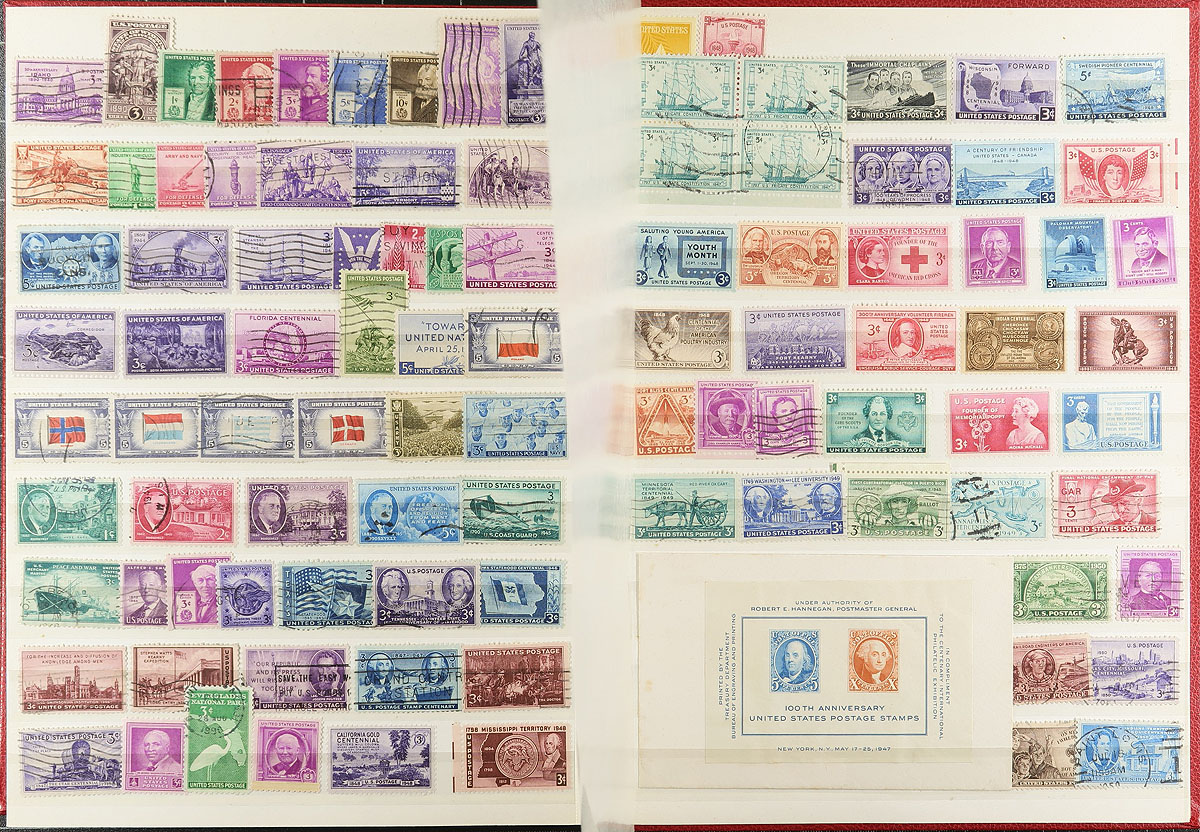 A pair of red stockbooks, both by Unitrade (one a 32-page, the other an old-stock 48 page) with different "end of consignment" offerings that although were not quite powerful on their own, combined make for an enticing offer. The first stockbook (32-page) is United Nations / Cinderella offering, with nicely curated lifetime mint UN collection, complete to 1983 for regular issues as well as the later Geneva and Vienna, with 711 different stamps (after 1983, both mint and used), followed by 624 mixed Cinderella / Label stamps and an sheet of "US Presidents" (for those thinking of being nostalgic for H.E. Harris approvals). The second stockbook (48-page) is the "World" with 23 countries, strength in USA to 1975, Japan, Yugoslavia, Mongolia and Turkey with 2789 different mint and used, plus 2 miniature sheets. All well organized by a meticulous collector. Estimate =
