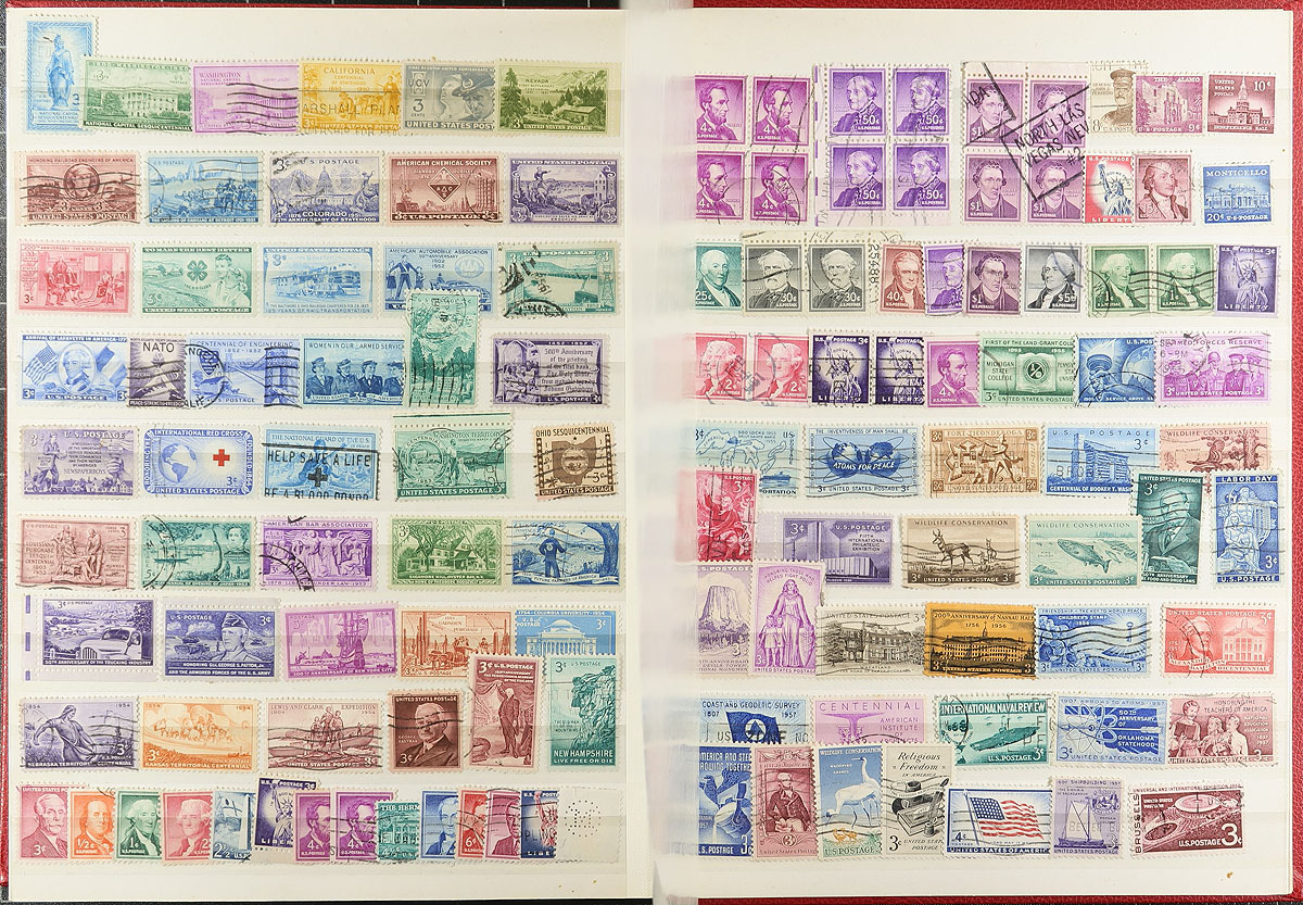 A pair of red stockbooks, both by Unitrade (one a 32-page, the other an old-stock 48 page) with different "end of consignment" offerings that although were not quite powerful on their own, combined make for an enticing offer. The first stockbook (32-page) is United Nations / Cinderella offering, with nicely curated lifetime mint UN collection, complete to 1983 for regular issues as well as the later Geneva and Vienna, with 711 different stamps (after 1983, both mint and used), followed by 624 mixed Cinderella / Label stamps and an sheet of "US Presidents" (for those thinking of being nostalgic for H.E. Harris approvals). The second stockbook (48-page) is the "World" with 23 countries, strength in USA to 1975, Japan, Yugoslavia, Mongolia and Turkey with 2789 different mint and used, plus 2 miniature sheets. All well organized by a meticulous collector. Estimate =