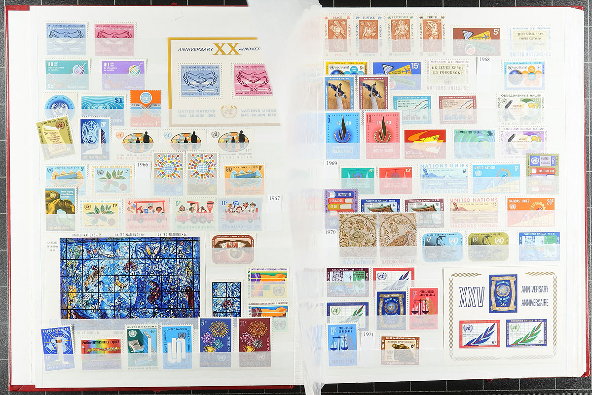 A pair of red stockbooks, both by Unitrade (one a 32-page, the other an old-stock 48 page) with different "end of consignment" offerings that although were not quite powerful on their own, combined make for an enticing offer. The first stockbook (32-page) is United Nations / Cinderella offering, with nicely curated lifetime mint UN collection, complete to 1983 for regular issues as well as the later Geneva and Vienna, with 711 different stamps (after 1983, both mint and used), followed by 624 mixed Cinderella / Label stamps and an sheet of "US Presidents" (for those thinking of being nostalgic for H.E. Harris approvals). The second stockbook (48-page) is the "World" with 23 countries, strength in USA to 1975, Japan, Yugoslavia, Mongolia and Turkey with 2789 different mint and used, plus 2 miniature sheets. All well organized by a meticulous collector. Estimate =
