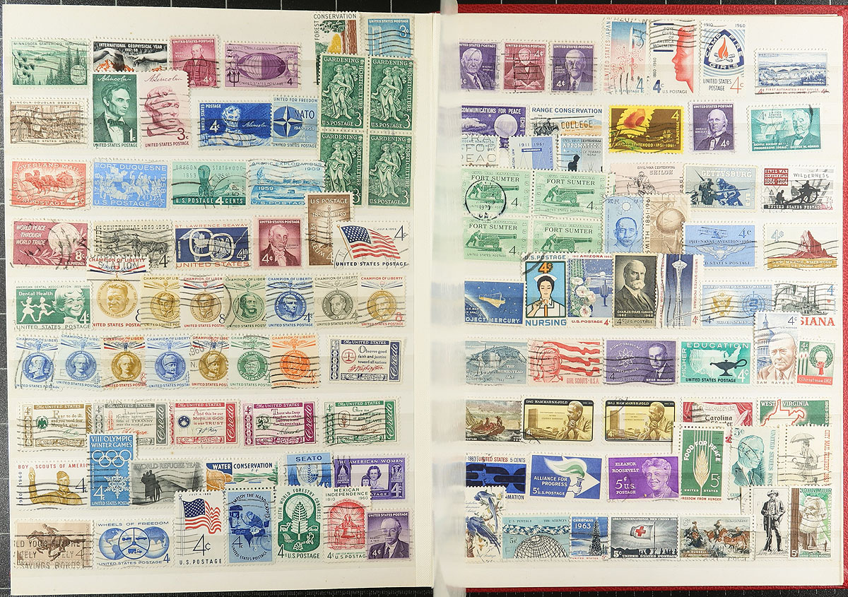 A pair of red stockbooks, both by Unitrade (one a 32-page, the other an old-stock 48 page) with different "end of consignment" offerings that although were not quite powerful on their own, combined make for an enticing offer. The first stockbook (32-page) is United Nations / Cinderella offering, with nicely curated lifetime mint UN collection, complete to 1983 for regular issues as well as the later Geneva and Vienna, with 711 different stamps (after 1983, both mint and used), followed by 624 mixed Cinderella / Label stamps and an sheet of "US Presidents" (for those thinking of being nostalgic for H.E. Harris approvals). The second stockbook (48-page) is the "World" with 23 countries, strength in USA to 1975, Japan, Yugoslavia, Mongolia and Turkey with 2789 different mint and used, plus 2 miniature sheets. All well organized by a meticulous collector. Estimate =