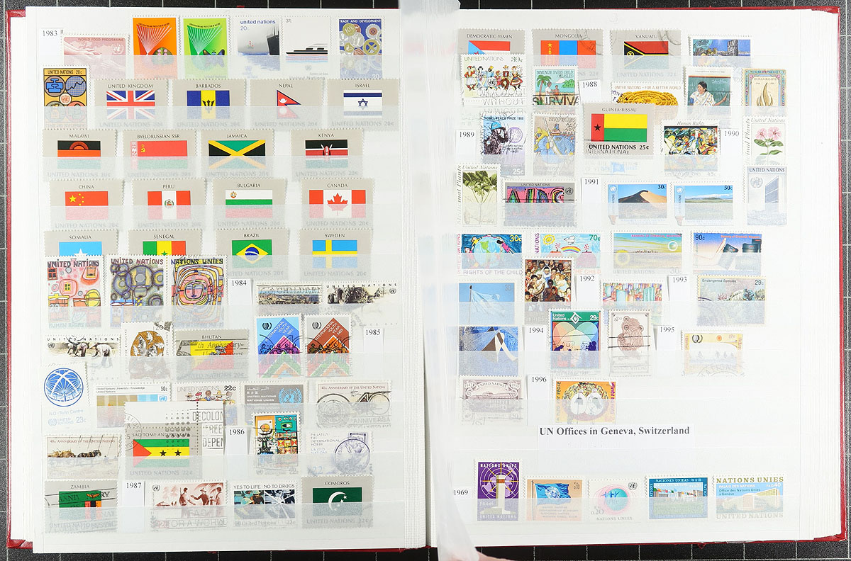 A pair of red stockbooks, both by Unitrade (one a 32-page, the other an old-stock 48 page) with different "end of consignment" offerings that although were not quite powerful on their own, combined make for an enticing offer. The first stockbook (32-page) is United Nations / Cinderella offering, with nicely curated lifetime mint UN collection, complete to 1983 for regular issues as well as the later Geneva and Vienna, with 711 different stamps (after 1983, both mint and used), followed by 624 mixed Cinderella / Label stamps and an sheet of "US Presidents" (for those thinking of being nostalgic for H.E. Harris approvals). The second stockbook (48-page) is the "World" with 23 countries, strength in USA to 1975, Japan, Yugoslavia, Mongolia and Turkey with 2789 different mint and used, plus 2 miniature sheets. All well organized by a meticulous collector. Estimate =