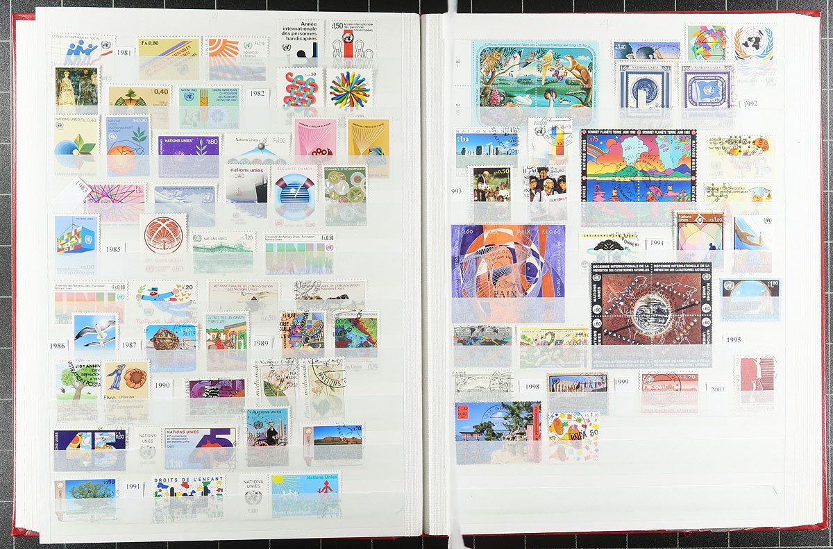 A pair of red stockbooks, both by Unitrade (one a 32-page, the other an old-stock 48 page) with different "end of consignment" offerings that although were not quite powerful on their own, combined make for an enticing offer. The first stockbook (32-page) is United Nations / Cinderella offering, with nicely curated lifetime mint UN collection, complete to 1983 for regular issues as well as the later Geneva and Vienna, with 711 different stamps (after 1983, both mint and used), followed by 624 mixed Cinderella / Label stamps and an sheet of "US Presidents" (for those thinking of being nostalgic for H.E. Harris approvals). The second stockbook (48-page) is the "World" with 23 countries, strength in USA to 1975, Japan, Yugoslavia, Mongolia and Turkey with 2789 different mint and used, plus 2 miniature sheets. All well organized by a meticulous collector. Estimate =