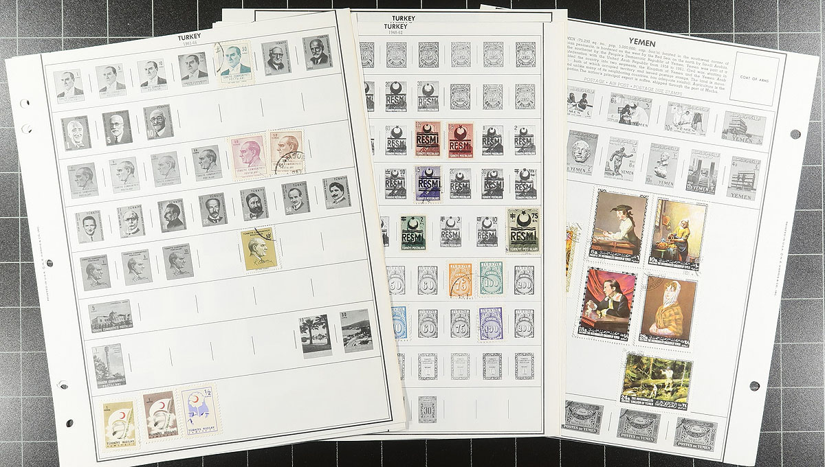 Duo of binders with well curated assembly of worldwide countries and "odds and ends". The first binder is the "world" with 945 different stamps comprising of Thailand (42 different used 1910-1993), United Nations (70 different, 1951-1967, plus one miniature sheet and 27 blocks), USA (492 different, 1870-2011 mostly used including 1 Hawaii), and USSR (341 different, 1875-1984 plus 3 miniature sheets and 1 corner block. The second binder contains a mixed bag of worldwide pages, packs including better Peru, Turkey and Yemen. Estimate =