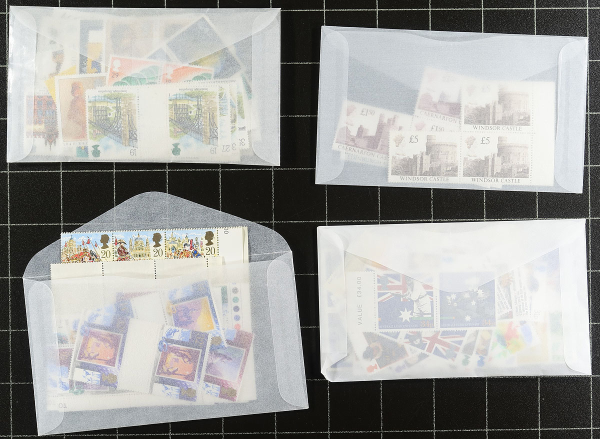Accumulation of never hinged stamps, 1980's-1990's, containing many hundreds of stamps in a few glassines and stockpages. The material was purchased through the philatelic services noting singles, sets, blocks, gutter blocks, and a few souvenir sheets, Machins (including Regionals), etc. The value is really in the face value postage as the stamps have a few wrinkles and slight odor due to improper storage, otherwise this would have catalogued several hundred of pounds. Face value totals £322.00 (noting 19p to £5 denominations, not counting the Machin values), and includes 60x 1ST issues. Still a good lot with a variety of purposes. Estimate =