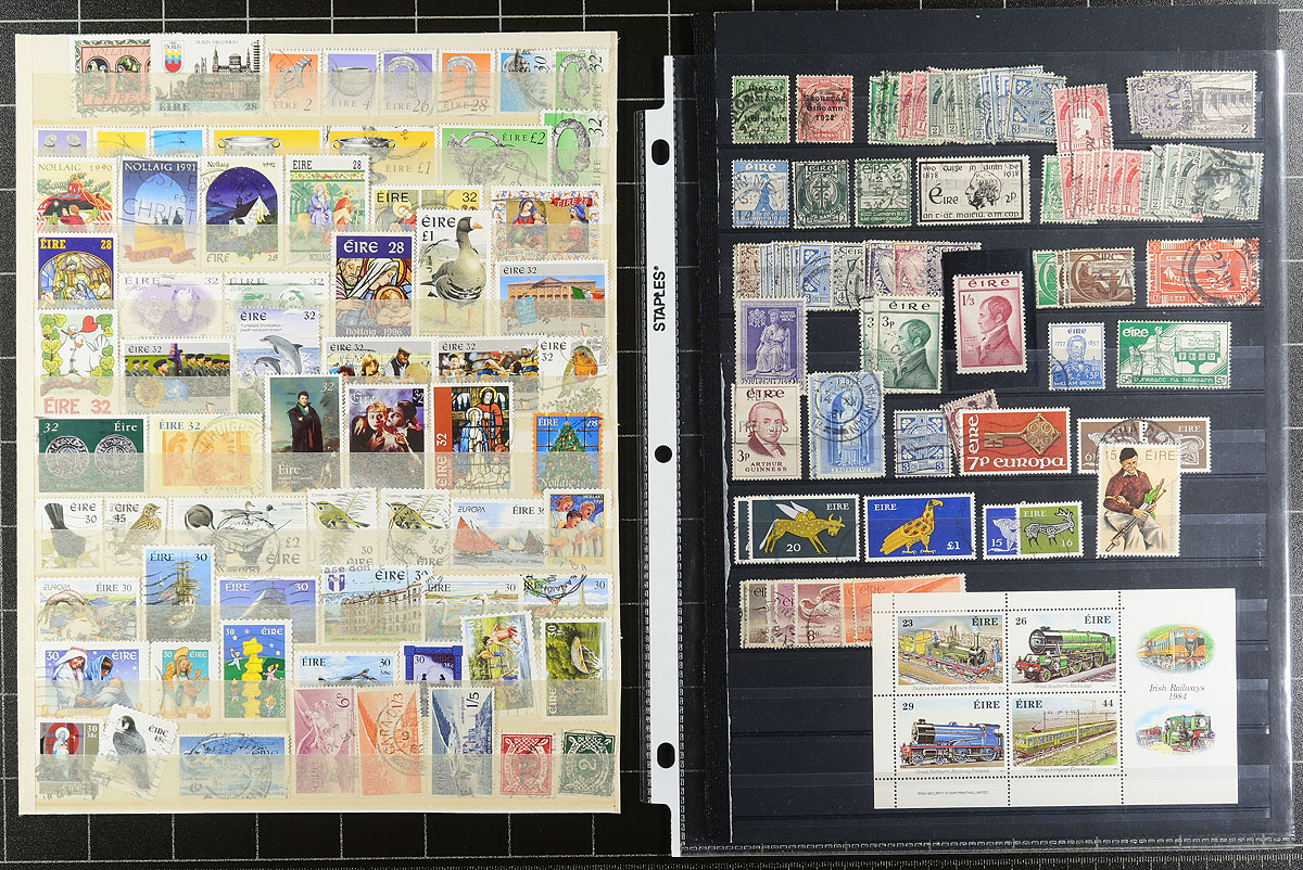 Nice accumulation of used Ireland, 1922-2012, containing roughly 1,150 stamps in over 15 stock pages. The lot generally ranges from Scott #1/1952, including back of the book issues, noting singles, sets, and partial sets cataloguing $10 and up each, including #s 72, 74, 76 ($57 total), 1997-2003 Birds issues, and more. Owner's 2008 Scott catalogue value for the lot totals US$2,082.00 ($2810.70 CDN), leaving better finds to the dedicated collector. A nice lot for collectors and dealers alike, with some duplication throughout, overall fine to very fine. Estimate =