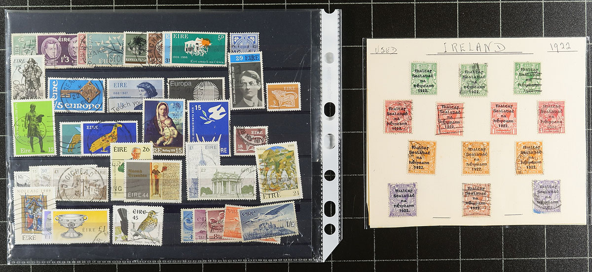 Nice accumulation of used Ireland, 1922-2012, containing roughly 1,150 stamps in over 15 stock pages. The lot generally ranges from Scott #1/1952, including back of the book issues, noting singles, sets, and partial sets cataloguing $10 and up each, including #s 72, 74, 76 ($57 total), 1997-2003 Birds issues, and more. Owner's 2008 Scott catalogue value for the lot totals US$2,082.00 ($2810.70 CDN), leaving better finds to the dedicated collector. A nice lot for collectors and dealers alike, with some duplication throughout, overall fine to very fine. Estimate =