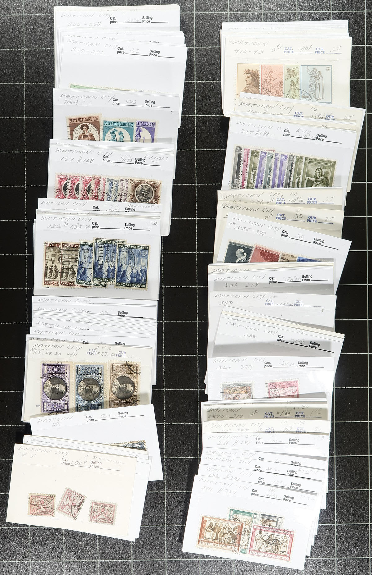 Accumulation of mint and used Vatican City, 1929-1998, containing roughly 1,000 stamps in a few formats including stock pages and a few hundred 102 cards. The lot is fairly organized and generally ranges from Scott #7/1086, including airmails and special delivery stamps. Each 102 card is identified using Scott numbers with most having current catalogue values, with a spot check of all the material indicating some singles and partial sets cataloguing $10 and up including #s 46 (used, $42.50), C16, C21-C23 (used, $59 total), leaving better finds to the dedicated collector. A good lot for the topical and thematic collector, overall fine to very fine. Estimate =