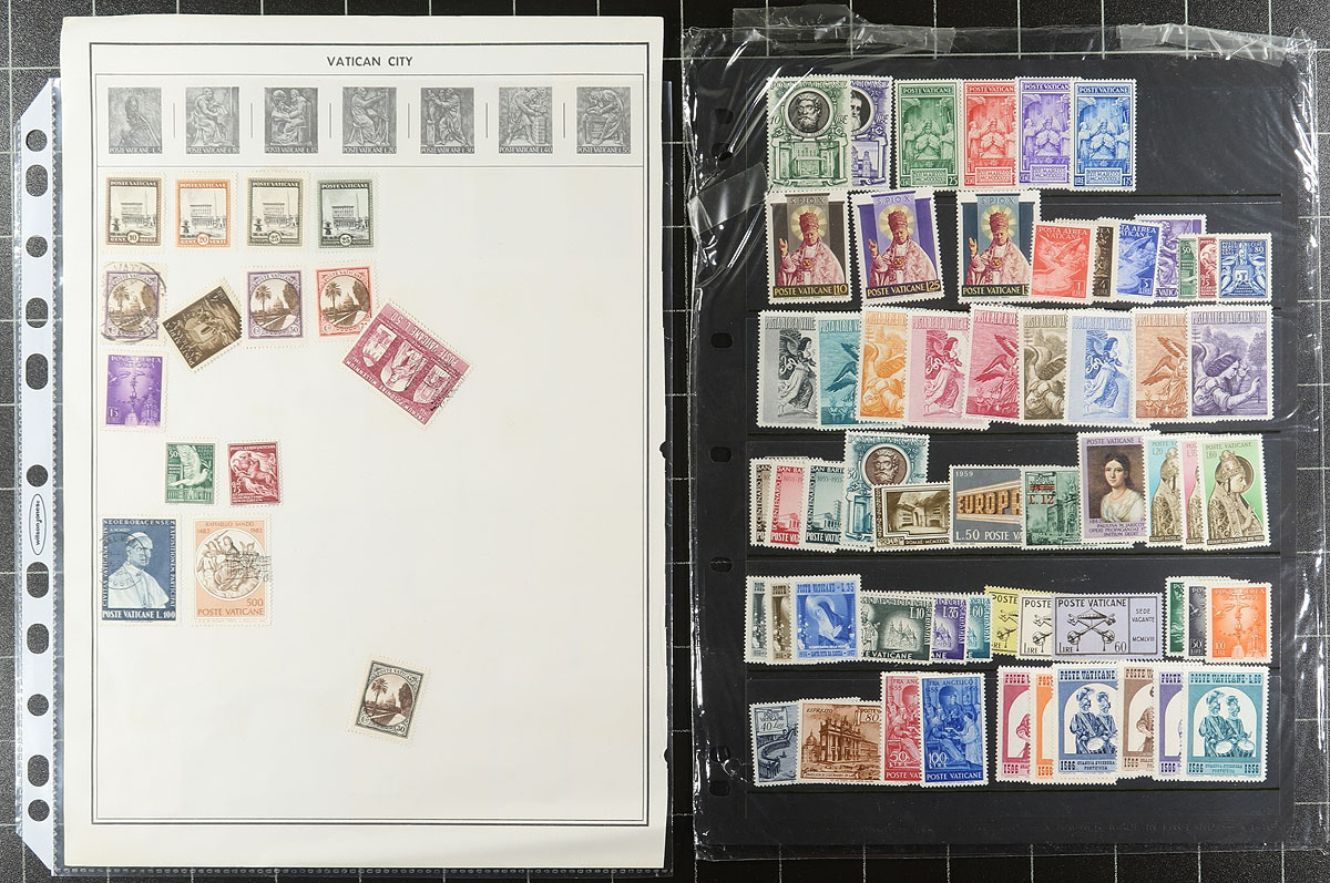 Accumulation of mint and used Vatican City, 1929-1998, containing roughly 1,000 stamps in a few formats including stock pages and a few hundred 102 cards. The lot is fairly organized and generally ranges from Scott #7/1086, including airmails and special delivery stamps. Each 102 card is identified using Scott numbers with most having current catalogue values, with a spot check of all the material indicating some singles and partial sets cataloguing $10 and up including #s 46 (used, $42.50), C16, C21-C23 (used, $59 total), leaving better finds to the dedicated collector. A good lot for the topical and thematic collector, overall fine to very fine. Estimate =