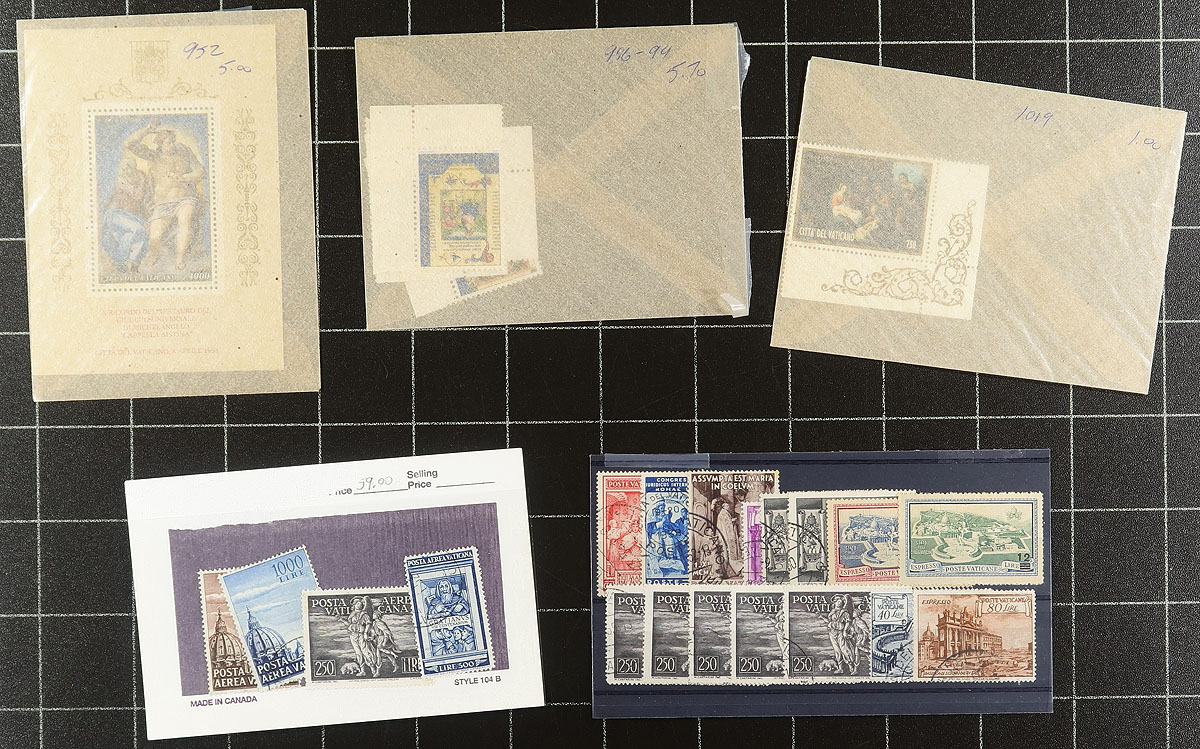 Accumulation of mint and used Vatican City, 1929-1998, containing roughly 1,000 stamps in a few formats including stock pages and a few hundred 102 cards. The lot is fairly organized and generally ranges from Scott #7/1086, including airmails and special delivery stamps. Each 102 card is identified using Scott numbers with most having current catalogue values, with a spot check of all the material indicating some singles and partial sets cataloguing $10 and up including #s 46 (used, $42.50), C16, C21-C23 (used, $59 total), leaving better finds to the dedicated collector. A good lot for the topical and thematic collector, overall fine to very fine. Estimate =