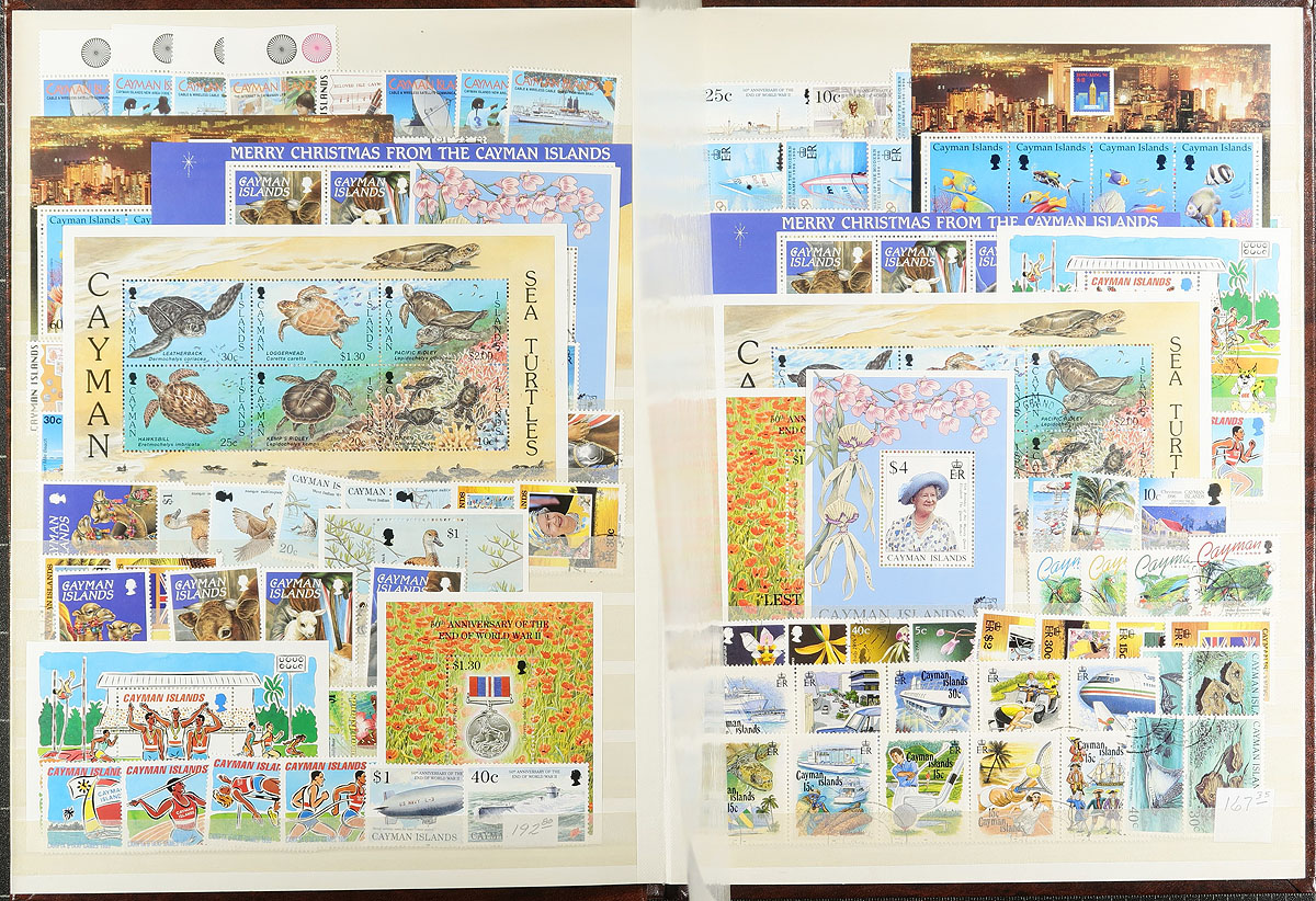Collection of never hinged and used Cayman Islands, 1986-2003, containing many hundreds of stamps in a stockbook. This nicely organized collection generally ranges from Scott #555/905, with a mint and a used example (post office cto), for most issues, including souvenir sheets, strips, etc. A spot check indicated items cataloguing $10 and up. A nice lot for collectors and dealers alike, clean and very fine. 2026 Scott US$1,451.00 =