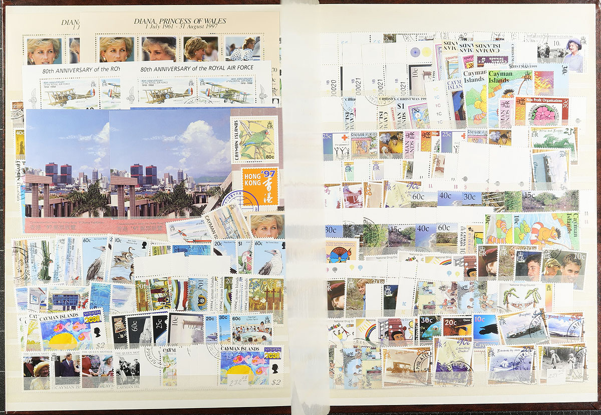 Collection of never hinged and used Cayman Islands, 1986-2003, containing many hundreds of stamps in a stockbook. This nicely organized collection generally ranges from Scott #555/905, with a mint and a used example (post office cto), for most issues, including souvenir sheets, strips, etc. A spot check indicated items cataloguing $10 and up. A nice lot for collectors and dealers alike, clean and very fine. 2026 Scott US$1,451.00 =