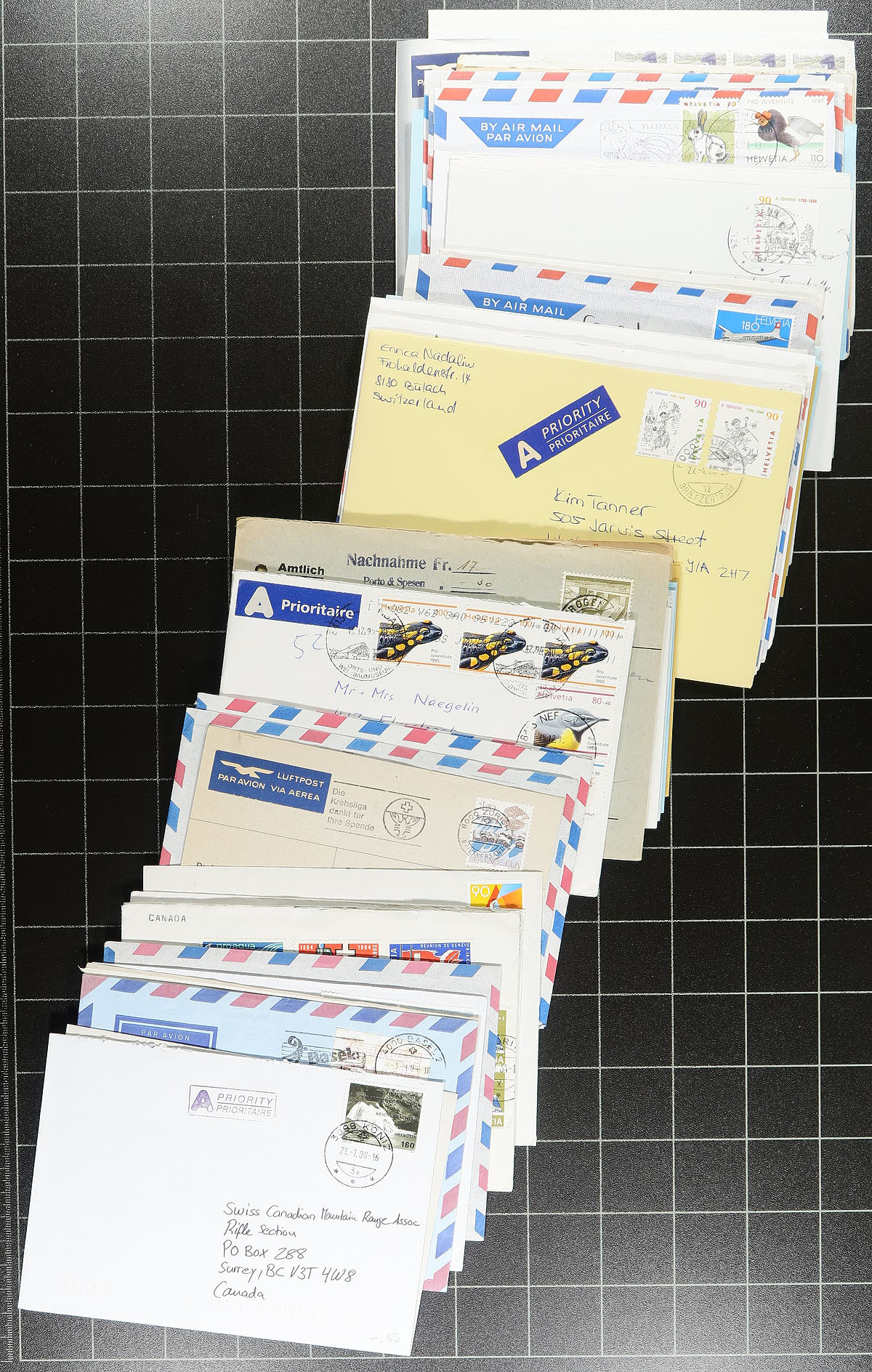 Postal History collection / accumulation of roughly 400 Switzerland covers, 1940's-1990's, loose in a box. The vast majority of material are first day covers, noting singles, sets, pairs, and souvenir sheet frankings, along with a few first flights, commercial covers, a few registered covers, and postal stationery, along with a wide range of pictorial cancels and bridge town postmarks. A nice clean lot of this popular collecting region for cover collectors and topical / thematic collectors as we note a good variety of suitable subjects. Overall fine to very fine. Estimate =