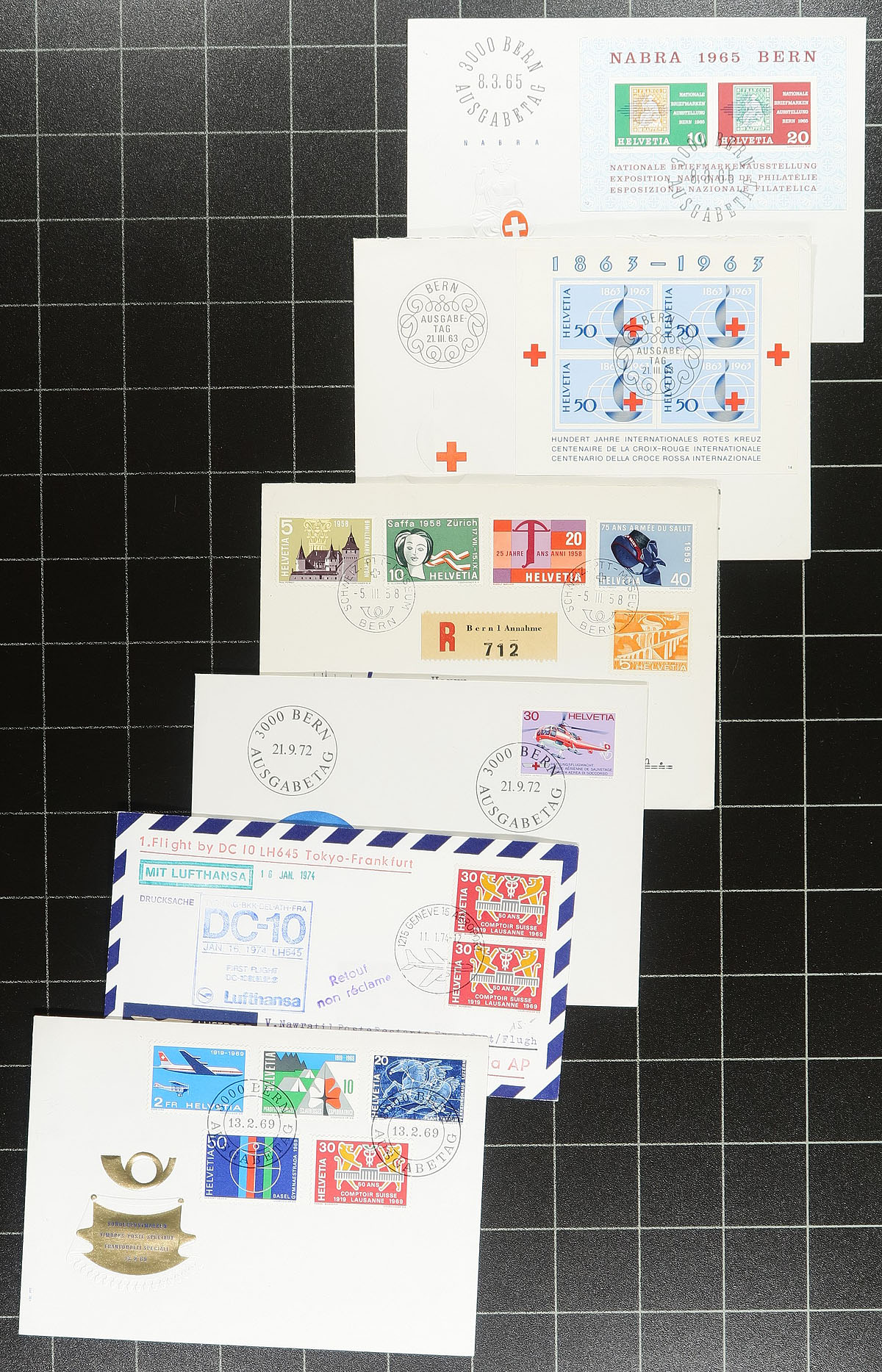 Postal History collection / accumulation of roughly 400 Switzerland covers, 1940's-1990's, loose in a box. The vast majority of material are first day covers, noting singles, sets, pairs, and souvenir sheet frankings, along with a few first flights, commercial covers, a few registered covers, and postal stationery, along with a wide range of pictorial cancels and bridge town postmarks. A nice clean lot of this popular collecting region for cover collectors and topical / thematic collectors as we note a good variety of suitable subjects. Overall fine to very fine. Estimate =