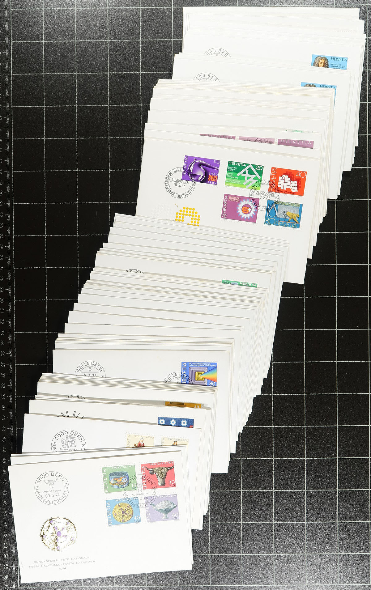 Postal History collection / accumulation of roughly 400 Switzerland covers, 1940's-1990's, loose in a box. The vast majority of material are first day covers, noting singles, sets, pairs, and souvenir sheet frankings, along with a few first flights, commercial covers, a few registered covers, and postal stationery, along with a wide range of pictorial cancels and bridge town postmarks. A nice clean lot of this popular collecting region for cover collectors and topical / thematic collectors as we note a good variety of suitable subjects. Overall fine to very fine. Estimate =